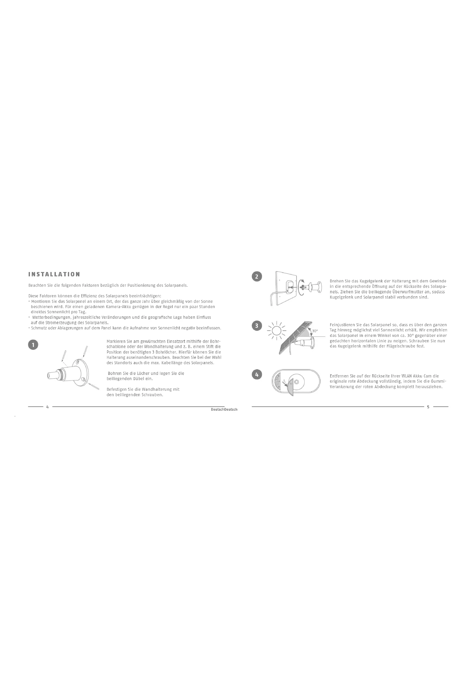 - In den Einstellungen der WLAN Akku Cam, die mit dem Solarpanel verbunden ist, muss der Betriebsmodus „Solar“ lauten. Gehen Sie dafür in der App den Pfad: Übersicht -> Menü -> Einstellungen -> Erweiterte Einstellungen -> Kamera 1- bzw. 2-Einstellungen -> Betriebsmodus App - App2Cam Plus - WICHTIGE HINWEISE Ihr Solarpanel ist bestmöglich platziert, wenn ... es so installiert ist, dass es über den Tag hinweg möglichst viel Sonneneinstrahlung erhält: auf der Nordhalbkugel (Standort z. B. in Europa, Nordamerika, Asien) in der Regel Richtung Süden, auf der Südhalbkugel (Standort z. B. in Südamerika, Australien) in der Regel Richtung Norden. es in einem Winkel von ca. 30° ausgerichtet ist (gegenüber einer gedachten horizontalen Linie) Beachten Sie außerdem: