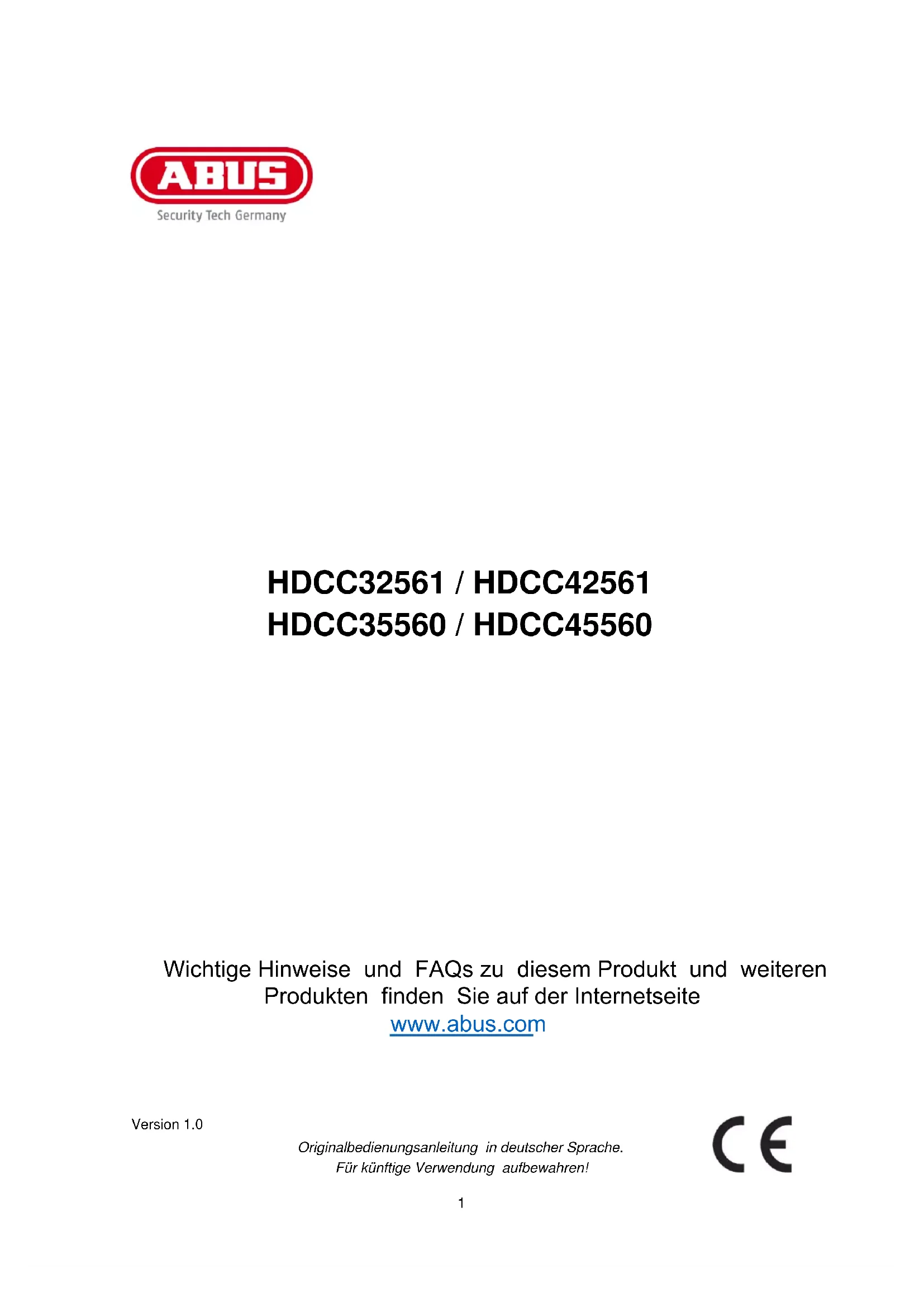 Version 1.0 Originalbedienungsanleitung in deutscher Sprache. Für künftige Verwendung aufbewahren!2 Deutsch Einführung Sehr geehrte Kundin, sehr geehrter Kunde, Wir bedanken uns für den Kauf dieses Produkts. Hiermit erklärt ABUS Security-Center, dass die Kameras die Anforderungen der folgenden EU- Richtlinien erfüllen: EMV Richtlinie 2014/30/EU sowie RoHS Richtlinie 2011/65/EU. Der vollständige Text der EU-Konformitätserklärung ist unter den folgenden Internetadressen verfügbar: www.abus.com/product/HDCC32561 www.abus.com/product/HDCC42561 www.abus.com/product/HDCC35560 www.abus.com/product/HDCC45560 Um diesen Zustand zu erhalten und einen gefahrenlosen Betrieb sicherzustellen, müssen Sie als Anwender diese Bedienungsanleitung beachten! Bei Fragen wenden Sie sich an Ihren Fachhandelspartner oder kontaktieren Sie unseren Kundenservice: Post: ABUS Support, Linker Kreuthweg 5, 86444 Affing, Deutschland E-Mail: support@abus-sc.com Tel: +49 8207 959 90 888 Öffnungszeiten Hotline: Mo-Do: 08 - 17 Uhr; Fr: 08 – 14 Uhr