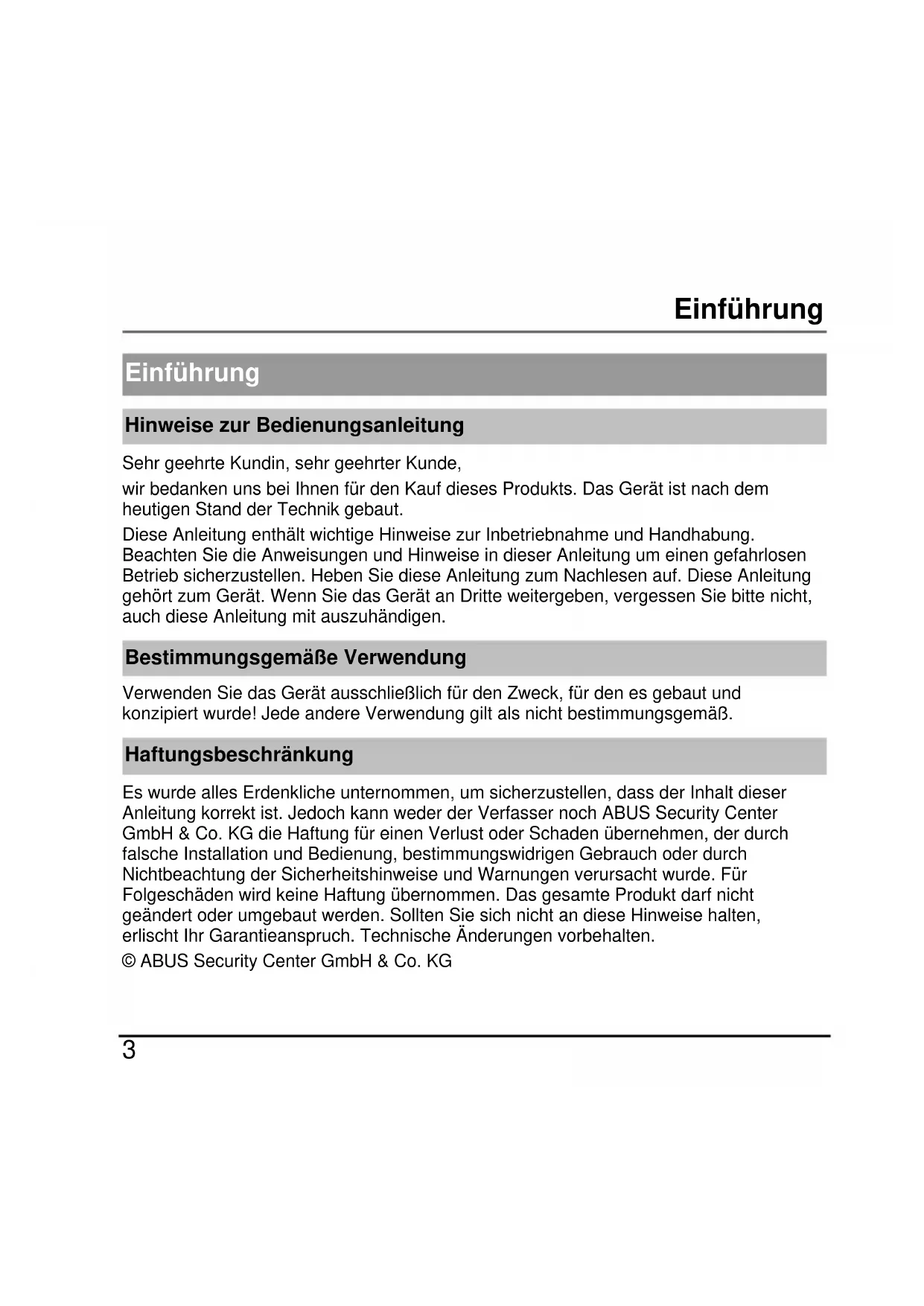 Einführung Hinweise zur Bedienungsanleitung Sehr geehrte Kundin, sehr geehrter Kunde, wir bedanken uns bei Ihnen für den Kauf dieses Produkts. Das Gerät ist nach dem heutigen Stand der Technik gebaut. Diese Anleitung enthält wichtige Hinweise zur Inbetriebnahme und Handhabung. Beachten Sie die Anweisungen und Hinweise in dieser Anleitung um einen gefahrlosen Betrieb sicherzustellen. Heben Sie diese Anleitung zum Nachlesen auf. Diese Anleitung gehört zum Gerät. Wenn Sie das Gerät an Dritte weitergeben, vergessen Sie bitte nicht, auch diese Anleitung mit auszuhändigen. Bestimmungsgemäße Verwendung Verwenden Sie das Gerät ausschließlich für den Zweck, für den es gebaut und konzipiert wurde! Jede andere Verwendung gilt als nicht bestimmungsgemäß. Haftungsbeschränkung Es wurde alles Erdenkliche unternommen, um sicherzustellen, dass der Inhalt dieser Anleitung korrekt ist. Jedoch kann weder der Verfasser noch ABUS Security Center GmbH & Co. KG die Haftung für einen Verlust oder Schaden übernehmen, der durch falsche Installation und Bedienung, bestimmungswidrigen Gebrauch oder durch Nichtbeachtung der Sicherheitshinweise und Warnungen verursacht wurde. Für Folgeschäden wird keine Haftung übernommen. Das gesamte Produkt darf nicht geändert oder umgebaut werden. Sollten Sie sich nicht an diese Hinweise halten, erlischt Ihr Garantieanspruch. Technische Änderungen vorbehalten. © ABUS Security Center GmbH & Co. KGSicherheitshinweise