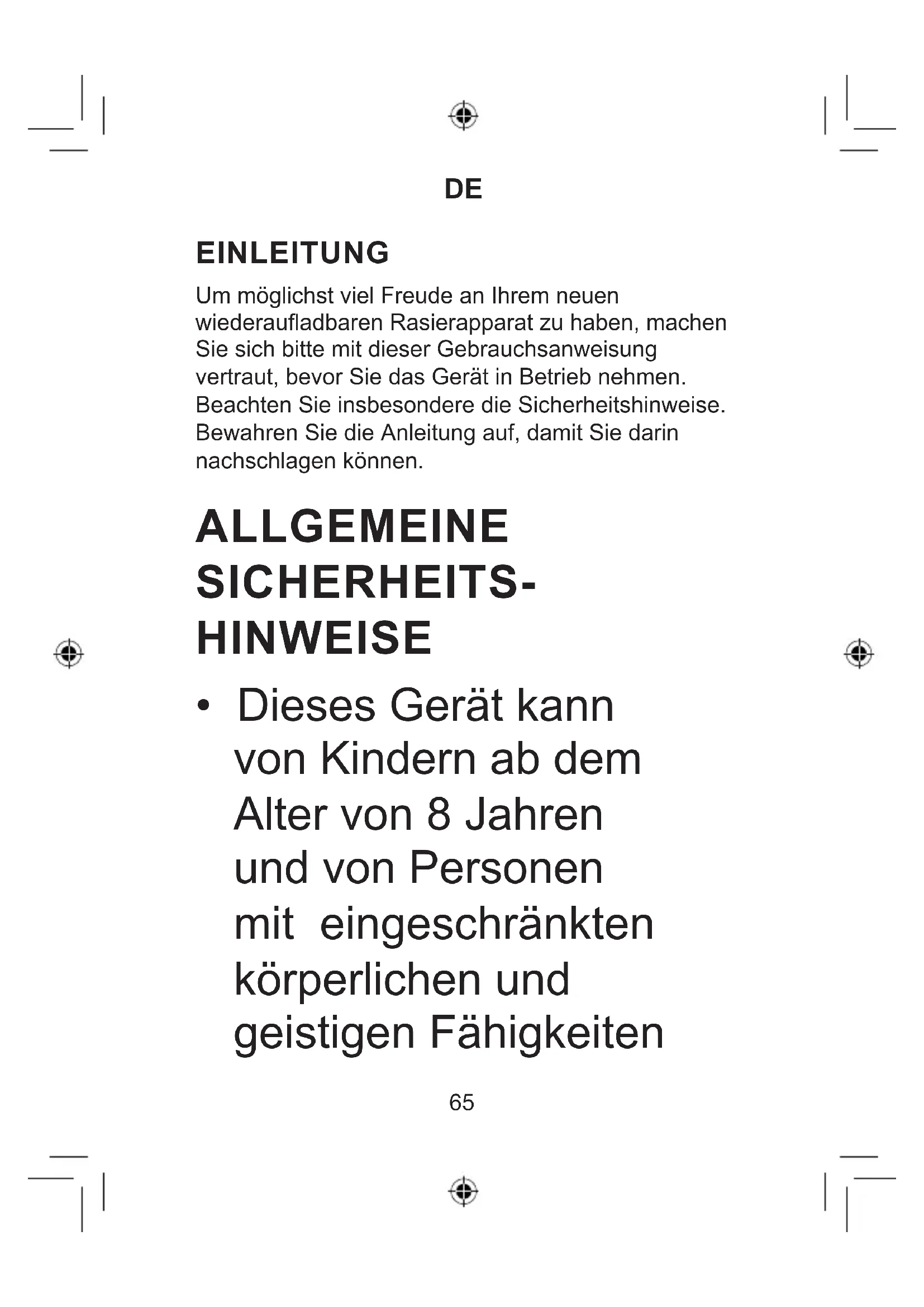 EINLEITUNG Um möglichst viel Freude an Ihrem neuen wiederauadbaren Rasierapparat zu haben, machen Sie sich bitte mit dieser Gebrauchsanweisung vertraut, bevor Sie das Gerät in Betrieb nehmen. Beachten Sie insbesondere die Sicherheitshinweise. Bewahren Sie die Anleitung auf, damit Sie darin nachschlagen können. ALLGEMEINE SICHERHEITS- HINWEISE