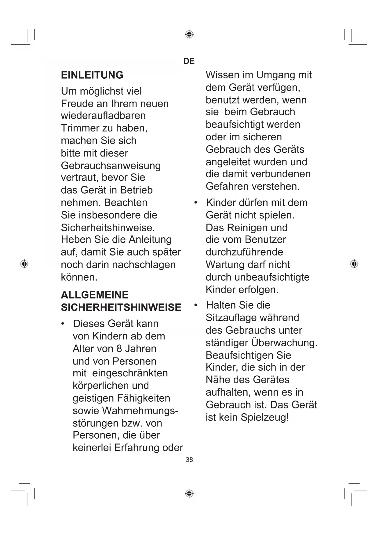 EINLEITUNG Um möglichst viel Freude an Ihrem neuen wiederaufladbaren Trimmer zu haben, machen Sie sich bitte mit dieser Gebrauchsanweisung vertraut, bevor Sie das Gerät in Betrieb nehmen. Beachten Sie insbesondere die Sicherheitshinweise. Heben Sie die Anleitung auf, damit Sie auch später noch darin nachschlagen können. ALLGEMEINE SICHERHEITSHINWEISE