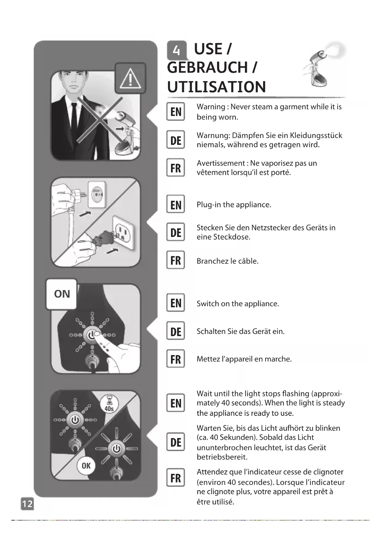 USE / GEBRAUCH / UTILISATION Warnung: Dämpfen Sie ein Kleidungsstück niemals, während es getragen wird.
