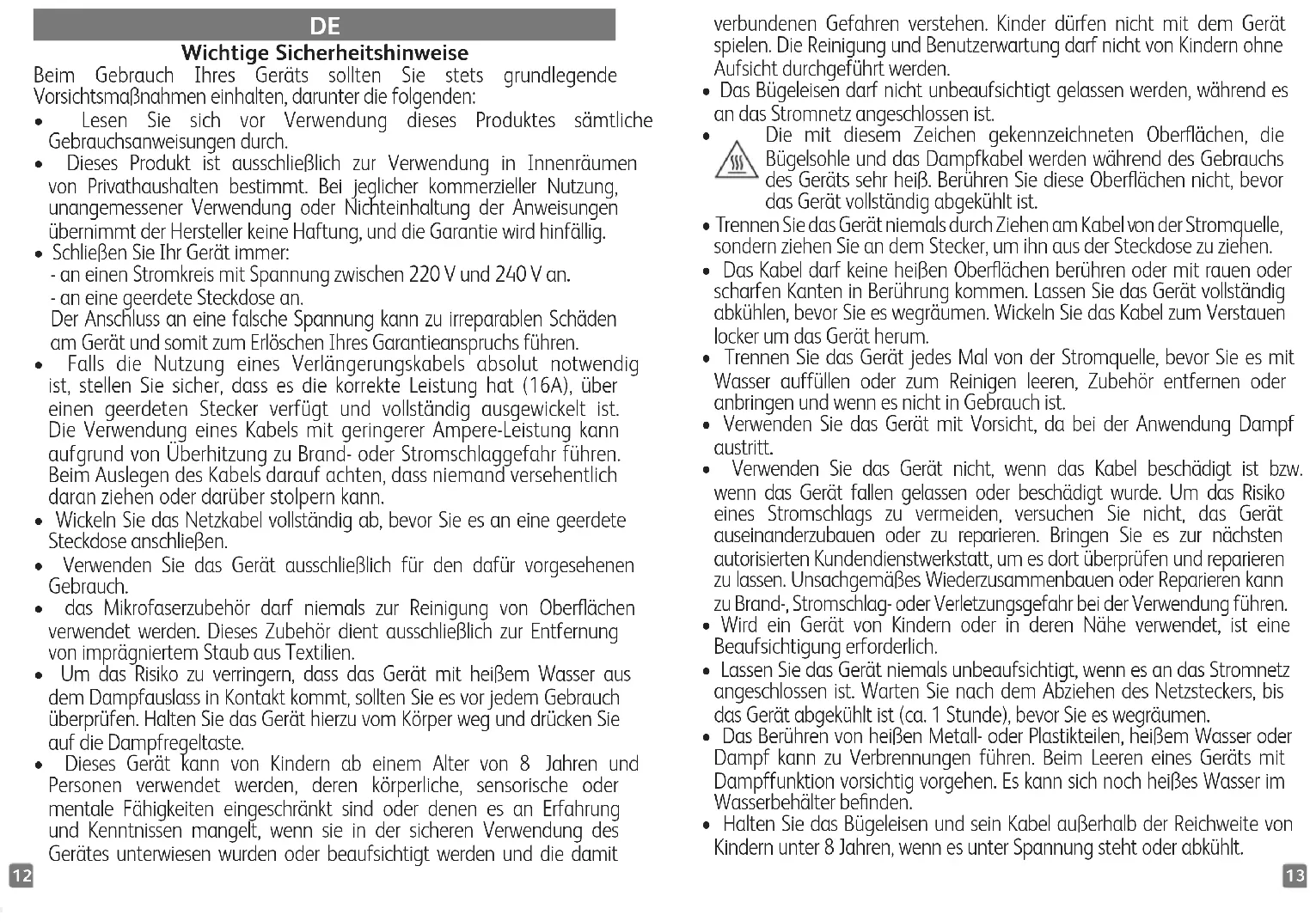 - Halten Sie das Bügeleisen und sein Kabel außerhalb der Reichweite von Kindern unter 8Jahren, wenn es unter Spannung steht oder abkühlt.15