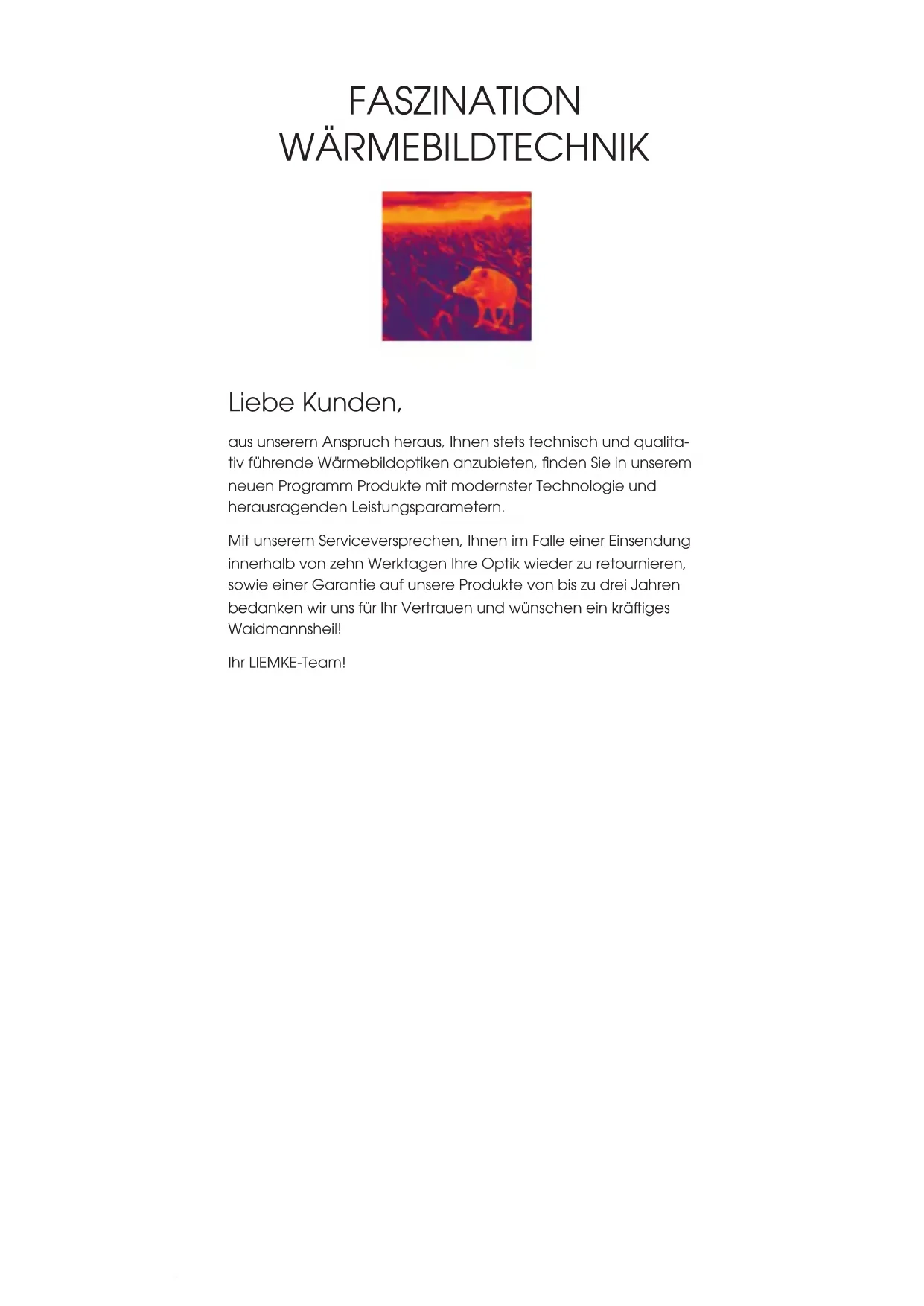 WÄRMEBILDTECHNIK Liebe Kunden, aus unserem Anspruch heraus, Ihnen stets technisch und qualita- tiv führende Wärmebildoptiken anzubieten, finden Sie in unserem neuen Programm Produkte mit modernster Technologie und herausragenden Leistungsparametern. Mit unserem Serviceversprechen, Ihnen im Falle einer Einsendung innerhalb von zehn Werktagen Ihre Optik wieder zu retournieren, sowie einer Garantie auf unsere Produkte von bis zu drei Jahren bedanken wir uns für Ihr Vertrauen und wünschen ein kräiges Waidmannsheil! Ihr LIEMKE-Team!INHALT