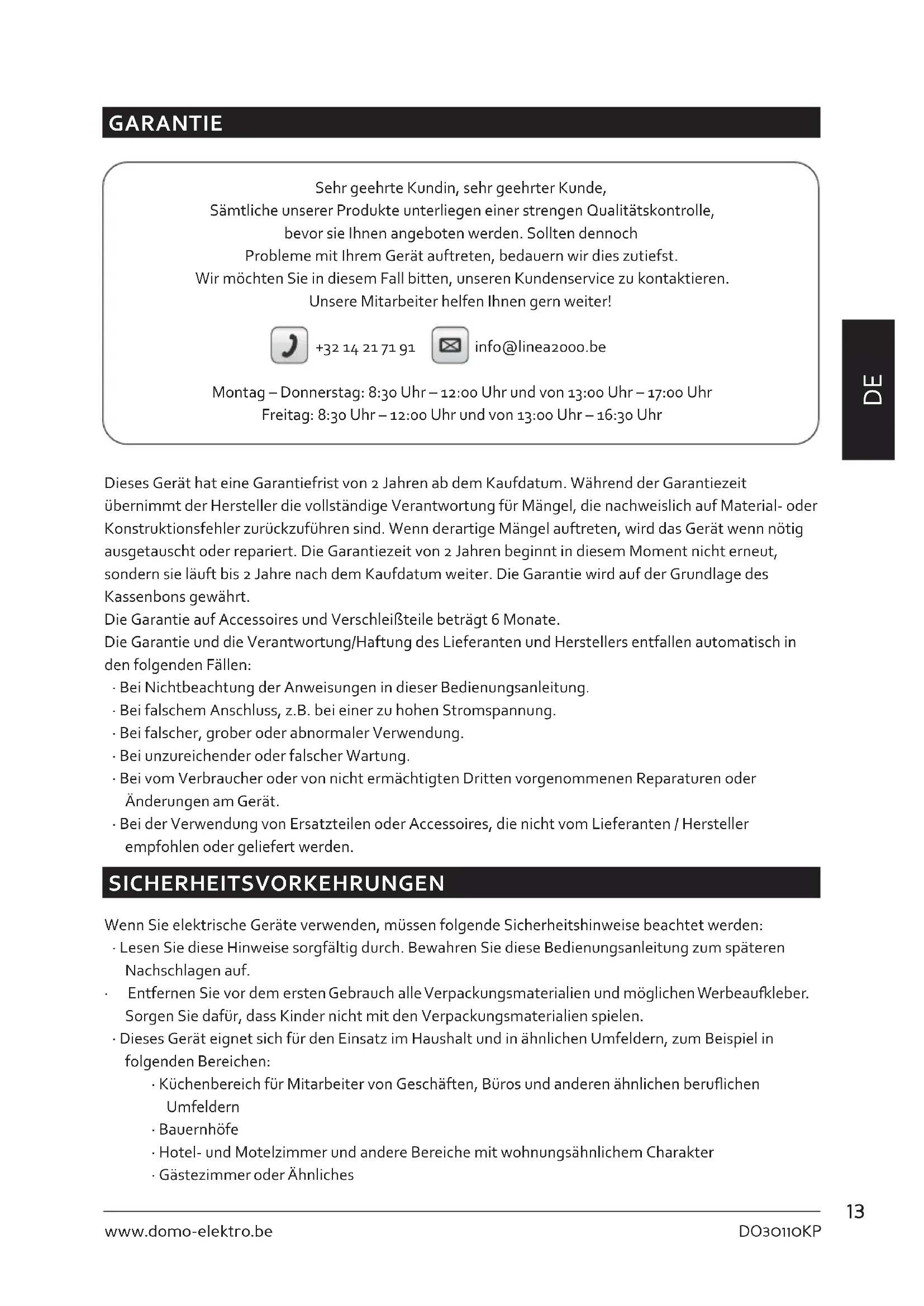 - Das Gerät ist nur auf den privaten Gebrauch ausgelegt. Der Hersteller ist nicht verantwortlich für Unfälle, die als Folge von unsachgemäßem Gebrauch des Geräts oder Nichtbefolgen der in dieser Anleitung aufgeführten Regeln entstehen.15 DO30110KP www.domo-elektro.be