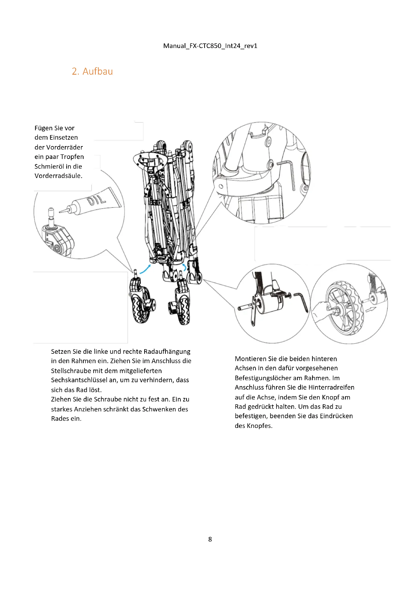 Fügen Sie vor dem Einsetzen der Vorderräder ein paar Tropfen Schmieröl in die Vorderradsäule. Montieren Sie die beiden hinteren Achsen in den dafür vorgesehenen Befestigungslöcher am Rahmen. Im Anschluss führen Sie die Hinterradreifen auf die Achse, indem Sie den Knopf am Rad gedrückt halten. Um das Rad zu befestigen, beenden Sie das Eindrücken des Knopfes. Setzen Sie die linke und rechte Radaufhängung in den Rahmen ein. Ziehen Sie im Anschluss die Stellschraube mit dem mitgelieferten Sechskantschlüssel an, um zu verhindern, dass sich das Rad löst. Ziehen Sie die Schraube nicht zu fest an. Ein zu starkes Anziehen schränkt das Schwenken des Rades ein.Manual_FX-CTC850_Int24_rev1