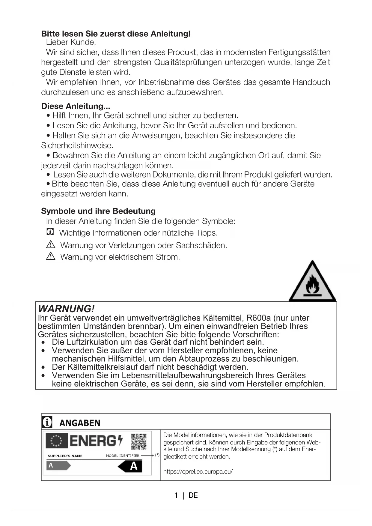 - Bitte beachten Sie, dass diese Anleitung eventuell auch für andere Geräte eingesetzt werden kann. Symbole und ihre Bedeutung In dieser Anleitung finden Sie die folgenden Symbole: C Wichtige Informationen oder nützliche Tipps. A Warnung vor Verletzungen oder Sachschäden. B Warnung vor elektrischem Strom. WARNUNG! Ihr Gerät verwendet ein umweltverträgliches Kältemittel, R600a (nur unter bestimmten Umständen brennbar). Um einen einwandfreien Betrieb Ihres Gerätes sicherzustellen, beachten Sie bitte folgende Vorschriften: