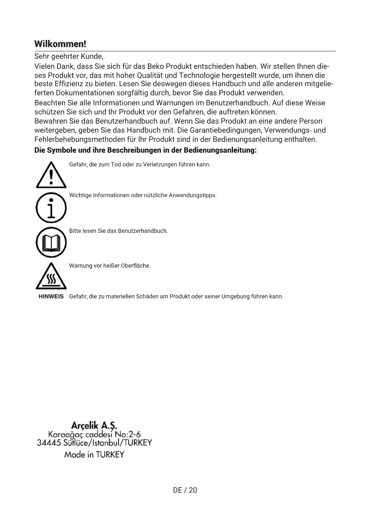 - There may be no electricity. >>> Ensure the mains is operational and check the fuses in the fuse box. Change the fuses if necessary or reactivate them.DE / 20 Wilkommen! Sehr geehrter Kunde, Vielen Dank, dass Sie sich für das Beko Produkt entschieden haben. Wir stellen Ihnen die- ses Produkt vor, das mit hoher Qualität und Technologie hergestellt wurde, um Ihnen die beste Effizienz zu bieten. Lesen Sie deswegen dieses Handbuch und alle anderen mitgelie- ferten Dokumentationen sorgfältig durch, bevor Sie das Produkt verwenden. Beachten Sie alle Informationen und Warnungen im Benutzerhandbuch. Auf diese Weise schützen Sie sich und Ihr Produkt vor den Gefahren, die auftreten können. Bewahren Sie das Benutzerhandbuch auf. Wenn Sie das Produkt an eine andere Person weitergeben, geben Sie das Handbuch mit. Die Garantiebedingungen, Verwendungs- und Fehlerbehebungsmethoden für Ihr Produkt sind in der Bedienungsanleitung enthalten. Die Symbole und ihre Beschreibungen in der Bedienungsanleitung: Gefahr, die zum Tod oder zu Verletzungen führen kann. Wichtige Informationen oder nützliche Anwendungstipps. Bitte lesen Sie das Benutzerhandbuch. Warnung vor heißer Oberfläche. HINWEIS Gefahr, die zu materiellen Schäden am Produkt oder seiner Umgebung führen kann.DE / 21 Inhaltsverzeichnis 1 Sicherheitshinweise ..................... 22