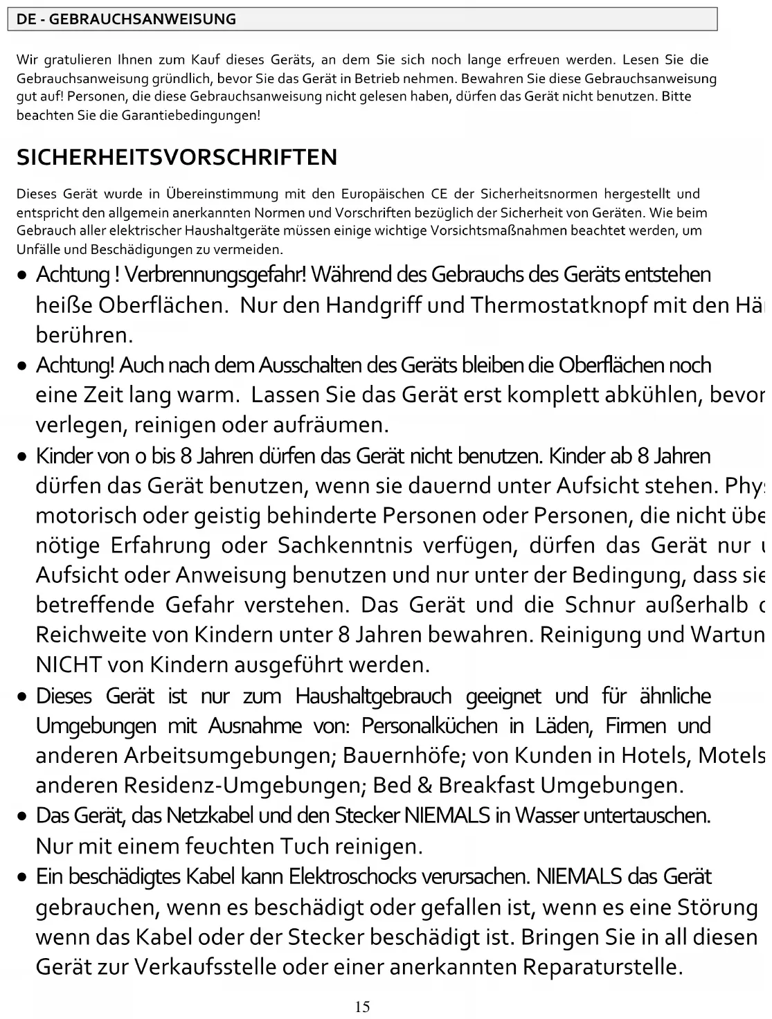 Wir gratulieren Ihnen zum Kauf dieses Geräts, an dem Sie sich noch lange erfreuen werden. Lesen Sie die Gebrauchsanweisung gründlich, bevor Sie das Gerät in Betrieb nehmen. Bewahren Sie diese Gebrauchsanweisung gut auf! Personen, die diese Gebrauchsanweisung nicht gelesen haben, dürfen das Gerät nicht benutzen. Bitte beachten Sie die Garantiebedingungen! SICHERHEITSVORSCHRIFTEN Dieses Gerät wurde in Übereinstimmung mit den Europäischen CE der Sicherheitsnormen hergestellt und entspricht den allgemein anerkannten Normen und Vorschriften bezüglich der Sicherheit von Geräten. Wie beim Gebrauch aller elektrischer Haushaltgeräte müssen einige wichtige Vorsichtsmaßnahmen beachtet werden, um Unfälle und Beschädigungen zu vermeiden.