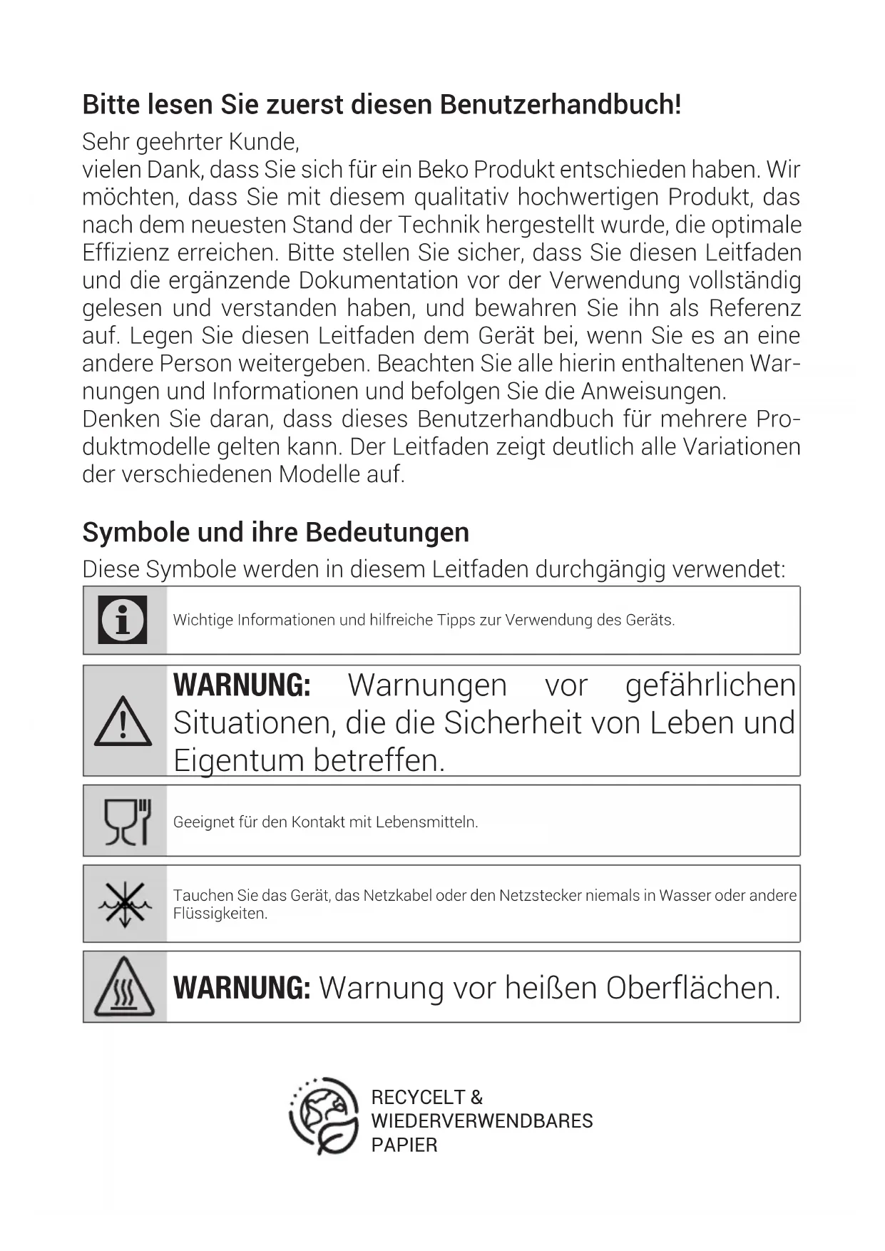 Please call our UK based Customer Service department if you need help or advice from us: United Kingdom and Northern Ireland: 0333 207 9710 Republic of Ireland: 01 862 3411 You can also contact us through our website: www.beko.co.ukBitte lesen Sie zuerst diesen Benutzerhandbuch! Sehr geehrter Kunde, vielen Dank, dass Sie sich für ein Beko Produkt entschieden haben. Wir möchten, dass Sie mit diesem qualitativ hochwertigen Produkt, das nach dem neuesten Stand der Technik hergestellt wurde, die optimale Effizienz erreichen. Bitte stellen Sie sicher, dass Sie diesen Leitfaden und die ergänzende Dokumentation vor der Verwendung vollständig gelesen und verstanden haben, und bewahren Sie ihn als Referenz auf. Legen Sie diesen Leitfaden dem Gerät bei, wenn Sie es an eine andere Person weitergeben. Beachten Sie alle hierin enthaltenen War- nungen und Informationen und befolgen Sie die Anweisungen. Denken Sie daran, dass dieses Benutzerhandbuch für mehrere Pro- duktmodelle gelten kann. Der Leitfaden zeigt deutlich alle Variationen der verschiedenen Modelle auf. Symbole und ihre Bedeutungen Diese Symbole werden in diesem Leitfaden durchgängig verwendet: