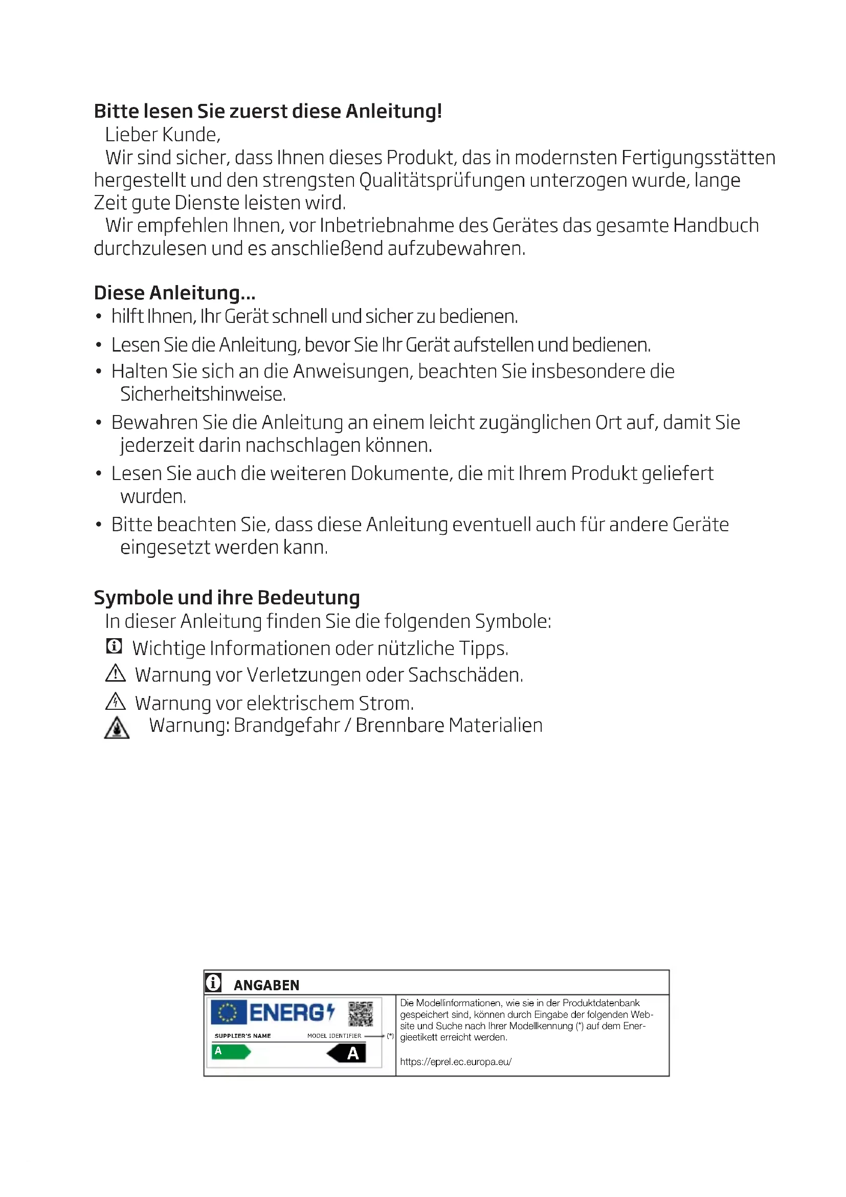 - Lesen Sie die Anleitung, bevor Sie Ihr Gerät aufstellen und bedienen.