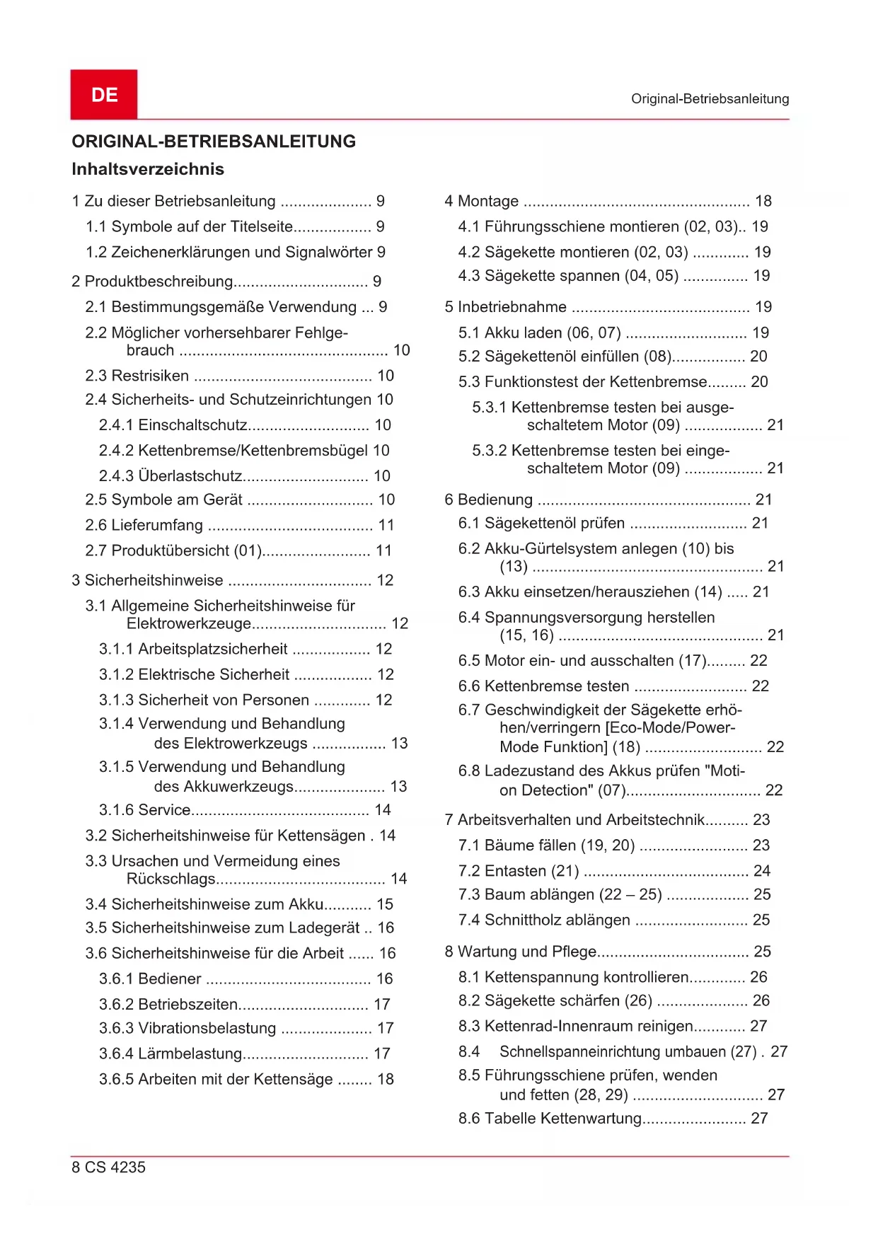 2469892_a 7DE 8 CS 4235 Original-Betriebsanleitung ORIGINAL-BETRIEBSANLEITUNG Inhaltsverzeichnis 1 Zu dieser Betriebsanleitung ..................... 9