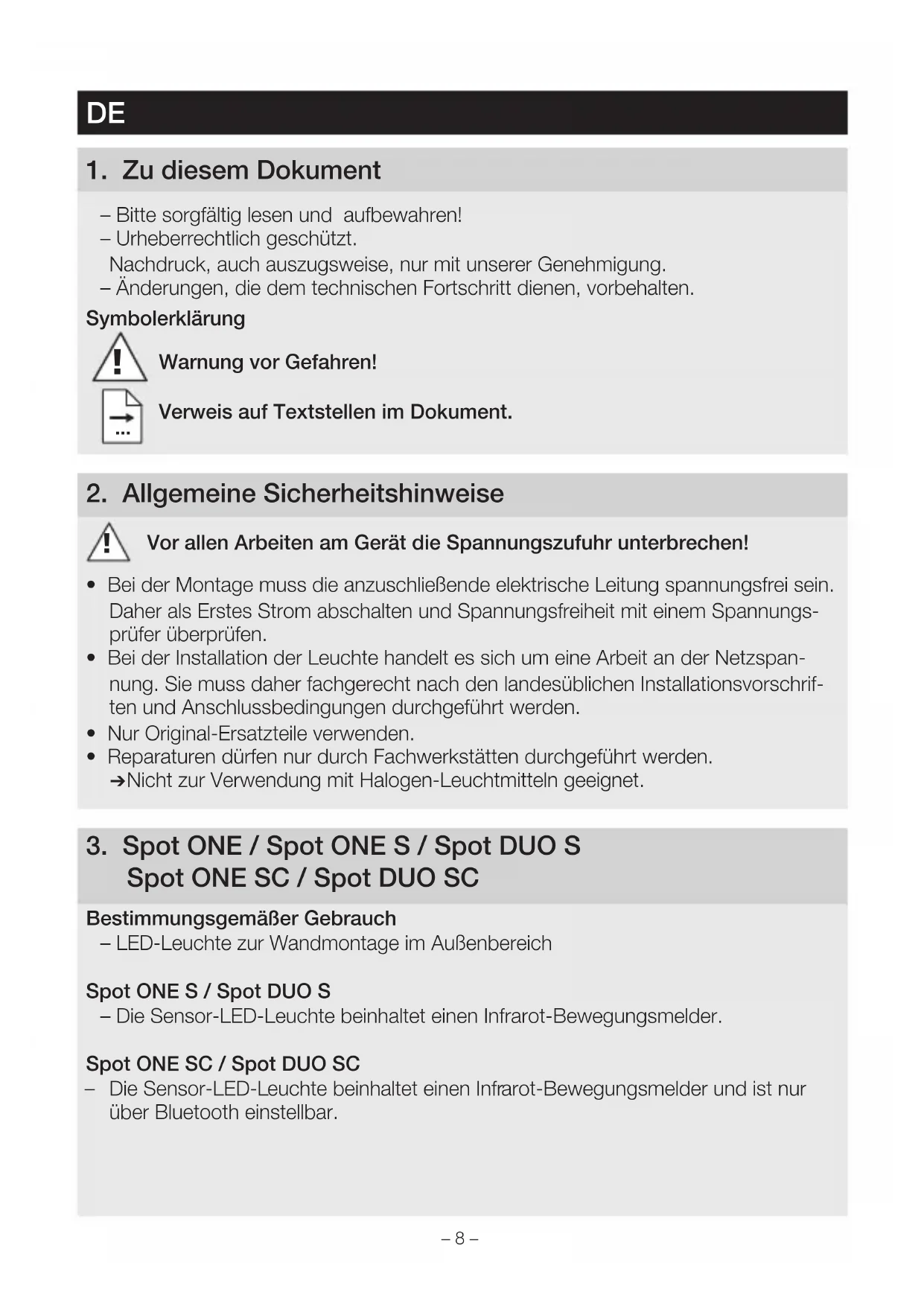 Spot ONESC / Spot DUO SC Bestimmungsgemäßer Gebrauch – LED-Leuchte zur Wandmontage im Außenbereich Spot ONES / Spot DUOS – Die Sensor-LED-Leuchte beinhaltet einen Infrarot-Bewegungsmelder. Spot ONESC / Spot DUOSC – Die Sensor-LED-Leuchte beinhaltet einen Infrarot-Bewegungsmelder und ist nur über Bluetooth einstellbar.– 9 – Nicht bestimmungsgemäßer Gebrauch – Die LED-Leuchte ist nicht dimmbar. Nicht dimmbar Lieferumfang Spot ONE (Abb. 3.1) – Leuchte – Drei Schrauben – Drei Dübel – Drei Abstandshalter Lieferumfang Spot DUO (Abb. 3.2) – Leuchte – Vier Schrauben – Vier Dübel – Vier Abstandshalter Produktmaße Spot ONE (Abb. 3.3) Spot DUO (Abb. 3.4) Produktübersicht (Abb. 3.5) A Wandhalter B Anschlussklemme C Sicherungsschraube D Leuchtenfuß E Leuchtengehäuse F Dämmerungseinstellung (nur Spot ONES / DUOS) G Zeiteinstellung (nur Spot ONES / DUOS) Erfassungsbereich Spot ONES / DUOS (Abb. 3.6 – 3.8) Lichtstärkeverteilung (Abb. 3.9)
