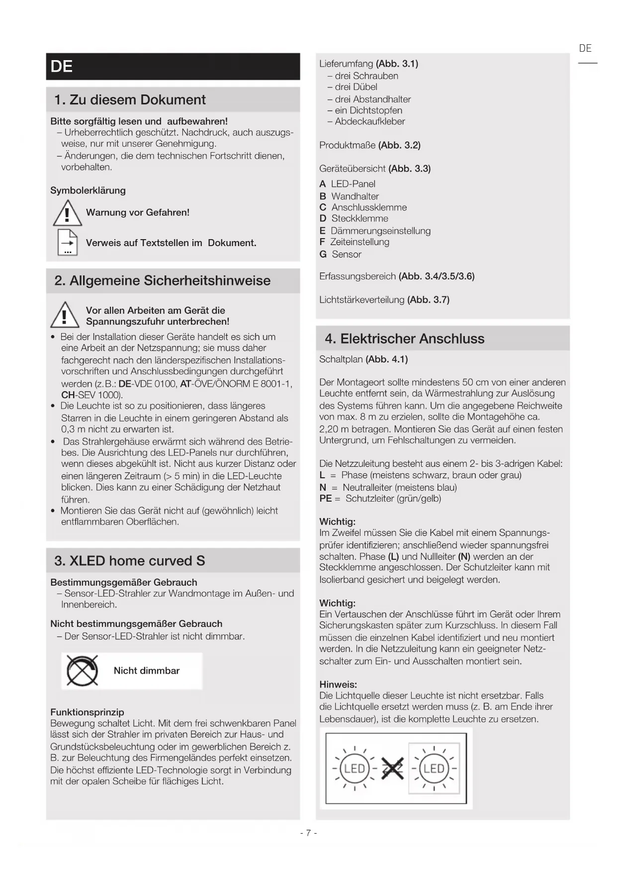 Warnung vor Gefahren! Verweis auf Textstellen im Dokument 2 Allgemeine Sicherheitshinweise Vor allen Arbeiten am Gerät die Spannungszufuhr unterbrechen! • Bei der Installation dieser Geräte handelt es sich um eine Arbeit an der Netzspannung; sie muss daher fachgerecht nach den länderspezifischen Installations-vorschriften und Anschlussbedingungen durchgeführt werden (z. B.: DE-VDE 0100, AT-ÖVE/ÖNORM E 8001-1, CH-SEV 1000).• Die Leuchte ist so zu positionieren, dass längeres Starren in die Leuchte in einem geringeren Abstand als 0,3m nicht zu erwarten ist.• Das Strahlergehäuse erwärmt sich während des Betrie-bes. Die Ausrichtung des LED-Panels nur durchführen, wenn dieses abgekühlt ist. Nicht aus kurzer Distanz oder einen längeren Zeitraum (> 5min) in die LED-Leuchte blicken. Dies kann zu einer Schädigung der Netzhaut führen.• Montieren Sie das Gerät nicht auf (gewöhnlich) leicht entflammbaren Oberflächen. 3 XLED home curved S Bestimmungsgemäßer Gebrauch – Sensor-LED-Strahler zur Wandmontage im Außen- und Innenbereich.Nicht bestimmungsgemäßer Gebrauch – Der Sensor-LED-Strahler ist nicht dimmbar.Nicht dimmbarFunktionsprinzipBewegung schaltet Licht. Mit dem frei schwenkbaren Panel lässt sich der Strahler im privaten Bereich zur Haus- und Grundstücksbeleuchtung oder im gewerblichen Bereich z. B. zur Beleuchtung des Firmengeländes perfekt einsetzen. Die höchst eziente LED-Technologie sorgt in Verbindung mit der opalen Scheibe für flächiges Licht.