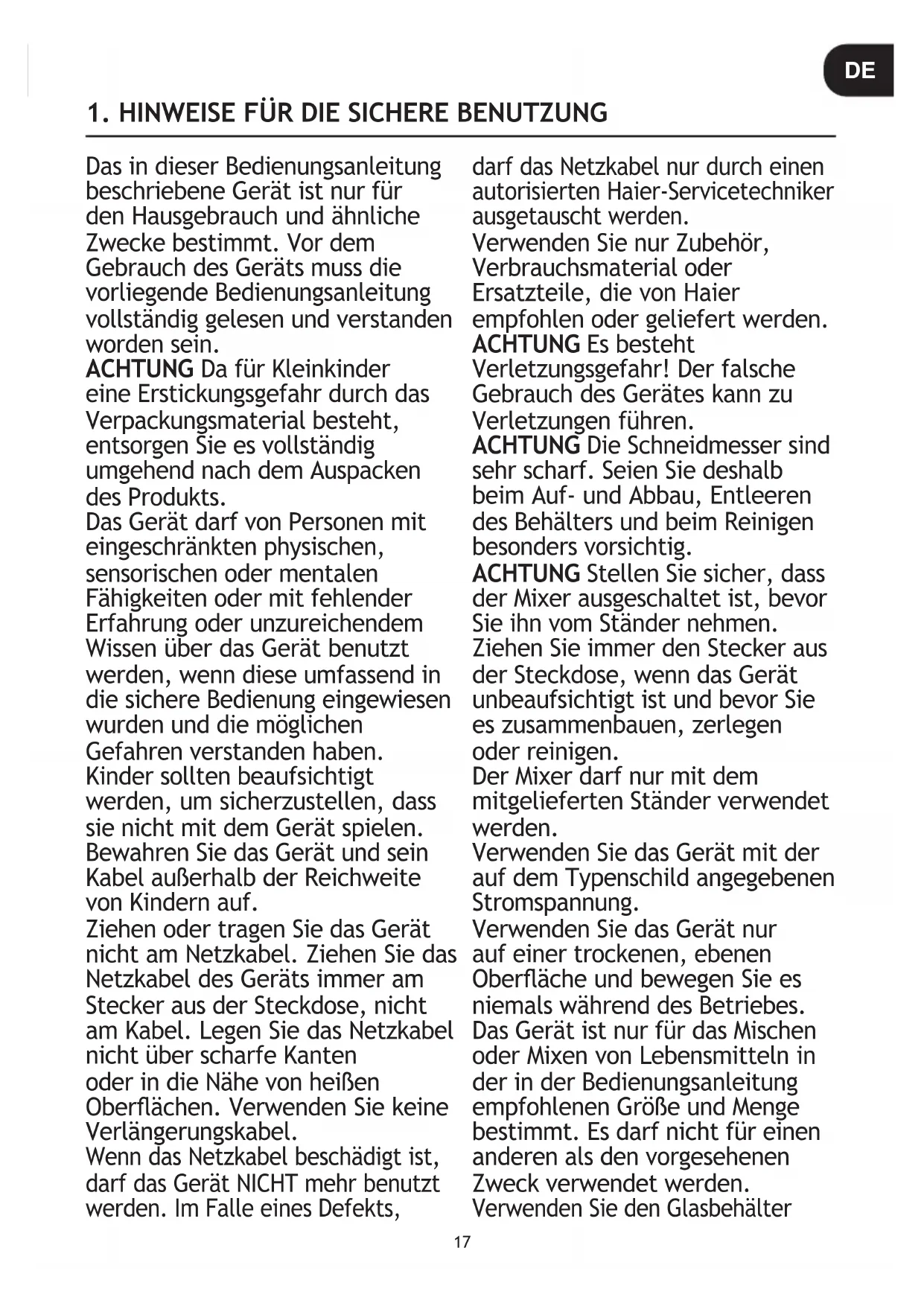 - Ne vous inquiétez pas si le liquide pénètre dans le corps principal car il y a un réservoir de vidange à l’intérieur. FR17 Das in dieser Bedienungsanleitung beschriebene Gerät ist nur für den Hausgebrauch und ähnliche Zwecke bestimmt. Vor dem Gebrauch des Geräts muss die vorliegende Bedienungsanleitung vollständig gelesen und verstanden worden sein. ACHTUNG Da für Kleinkinder eine Erstickungsgefahr durch das Verpackungsmaterial besteht, entsorgen Sie es vollständig umgehend nach dem Auspacken des Produkts. Das Gerät darf von Personen mit eingeschränkten physischen, sensorischen oder mentalen Fähigkeiten oder mit fehlender Erfahrung oder unzureichendem Wissen über das Gerät benutzt werden, wenn diese umfassend in die sichere Bedienung eingewiesen wurden und die möglichen Gefahren verstanden haben. Kinder sollten beaufsichtigt werden, um sicherzustellen, dass sie nicht mit dem Gerät spielen. Bewahren Sie das Gerät und sein Kabel außerhalb der Reichweite von Kindern auf. Ziehen oder tragen Sie das Gerät nicht am Netzkabel. Ziehen Sie das Netzkabel des Geräts immer am Stecker aus der Steckdose, nicht am Kabel. Legen Sie das Netzkabel nicht über scharfe Kanten oder in die Nähe von heißen Oberächen. Verwenden Sie keine Verlängerungskabel. Wenn das Netzkabel beschädigt ist, darf das Gerät NICHT mehr benutzt werden. Im Falle eines Defekts, darf das Netzkabel nur durch einen autorisierten Haier-Servicetechniker ausgetauscht werden. Verwenden Sie nur Zubehör, Verbrauchsmaterial oder Ersatzteile, die von Haier empfohlen oder geliefert werden. ACHTUNG Es besteht Verletzungsgefahr! Der falsche Gebrauch des Gerätes kann zu Verletzungen führen. ACHTUNG Die Schneidmesser sind sehr scharf. Seien Sie deshalb beim Auf- und Abbau, Entleeren des Behälters und beim Reinigen besonders vorsichtig. ACHTUNG Stellen Sie sicher, dass der Mixer ausgeschaltet ist, bevor Sie ihn vom Ständer nehmen. Ziehen Sie immer den Stecker aus der Steckdose, wenn das Gerät unbeaufsichtigt ist und bevor Sie es zusammenbauen, zerlegen oder reinigen. Der Mixer darf nur mit dem mitgelieferten Ständer verwendet werden. Verwenden Sie das Gerät mit der auf dem Typenschild angegebenen Stromspannung. Verwenden Sie das Gerät nur auf einer trockenen, ebenen Oberäche und bewegen Sie es niemals während des Betriebes. Das Gerät ist nur für das Mischen oder Mixen von Lebensmitteln in der in der Bedienungsanleitung empfohlenen Größe und Menge bestimmt. Es darf nicht für einen anderen als den vorgesehenen Zweck verwendet werden. Verwenden Sie den Glasbehälter
