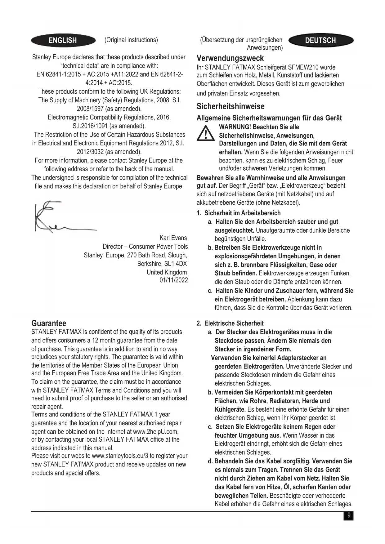 SFMEW210 Schleifgerät STANLEY FATMAX erklärt, dass diese unter „Technische Daten“ beschriebenen Geräte übereinstimmen mit: EN 62841-1:2015 + AC:2015 +A11:2022 und EN 62841-2- 4:2014 + AC:2015. Diese Produkte entsprechen außerdem den Richtlinien 2006/42/EC, 2014/30/EU und 2011/65/EU. Weitere Informationen erhalten Sie von STANLEY FATMAX unter der folgenden Adresse. Diese bendet sich auch auf der Rückseite dieser Anleitung. Der Unterzeichnete ist verantwortlich für die Zusammenstellung des technischen Dossiers und gibt diese Erklärung im Namen von STANLEY FATMAX ab. Patrick Diepenbach General Manager, Benelux Stanley FatMax, Egide Walschaertsstraat 14-18 2800 Mechelen, Belgien
