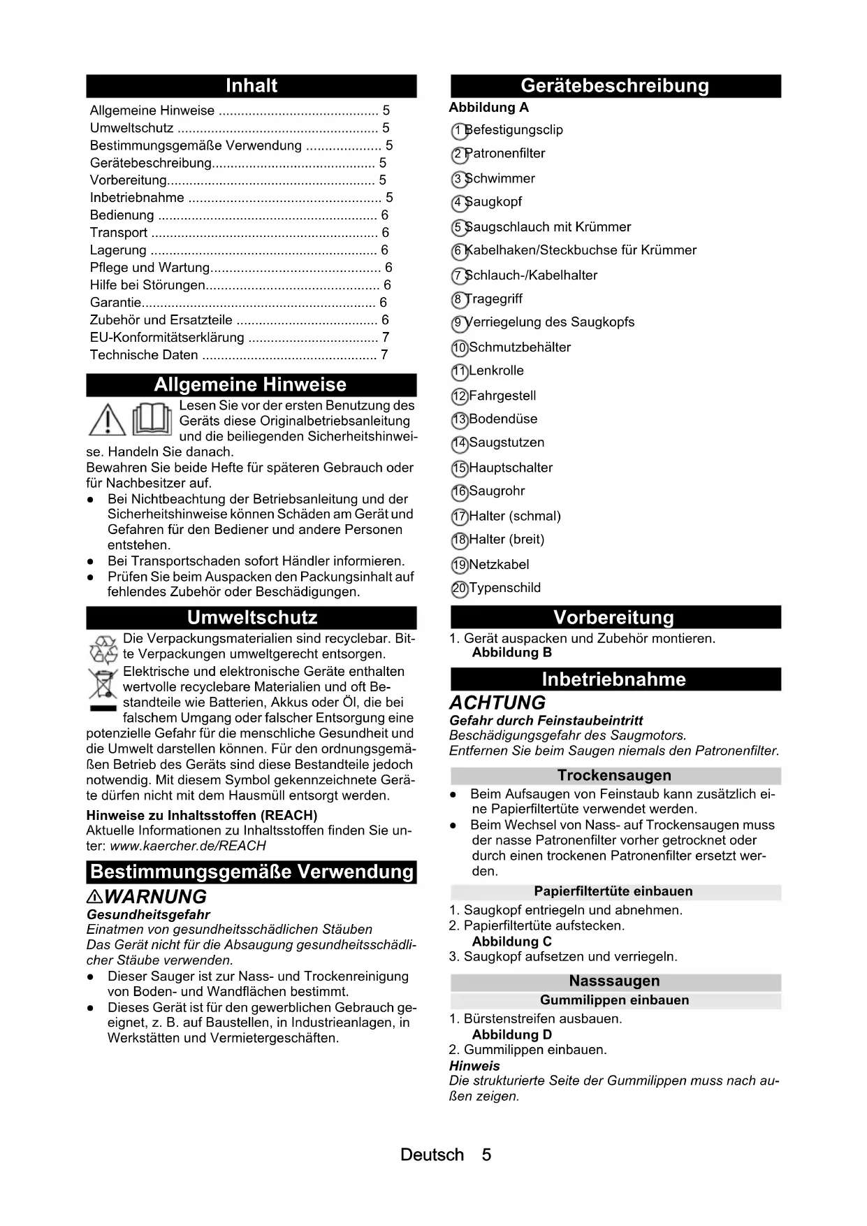 E FDeutsch 5 Inhalt Allgemeine Hinweise Lesen Sie vor der ersten Benutzung des Geräts diese Originalbetriebsanleitung und die beiliegenden Sicherheitshinwei- se. Handeln Sie danach. Bewahren Sie beide Hefte für späteren Gebrauch oder für Nachbesitzer auf. ● Bei Nichtbeachtung der Betriebsanleitung und der Sicherheitshinweise können Schäden am Gerät und Gefahren für den Bediener und andere Personen entstehen. ● Bei Transportschaden sofort Händler informieren. ● Prüfen Sie beim Auspacken den Packungsinhalt auf fehlendes Zubehör oder Beschädigungen. Umweltschutz Die Verpackungsmaterialien sind recyclebar. Bit- te Verpackungen umweltgerecht entsorgen. Elektrische und elektronische Geräte enthalten wertvolle recyclebare Materialien und oft Be- standteile wie Batterien, Akkus oder Öl, die bei falschem Umgang oder falscher Entsorgung eine potenzielle Gefahr für die menschliche Gesundheit und die Umwelt darstellen können. Für den ordnungsgemä- ßen Betrieb des Geräts sind diese Bestandteile jedoch notwendig. Mit diesem Symbol gekennzeichnete Gerä- te dürfen nicht mit dem Hausmüll entsorgt werden. Hinweise zu Inhaltsstoffen (REACH) Aktuelle Informationen zu Inhaltsstoffen finden Sie un- ter: www.kaercher.de/REACH Bestimmungsgemäße Verwendung 몇 WARNUNG Gesundheitsgefahr Einatmen von gesundheitsschädlichen Stäuben Das Gerät nicht für die Absaugung gesundheitsschädli- cher Stäube verwenden. ● Dieser Sauger ist zur Nass- und Trockenreinigung von Boden- und Wandflächen bestimmt. ● Dieses Gerät ist für den gewerblichen Gebrauch ge- eignet, z. B. auf Baustellen, in Industrieanlagen, in Werkstätten und Vermietergeschäften. Gerätebeschreibung Abbildung A 1 Befestigungsclip 2 Patronenfilter 3 Schwimmer 4 Saugkopf 5 Saugschlauch mit Krümmer 6 Kabelhaken/Steckbuchse für Krümmer 7 Schlauch-/Kabelhalter 8 Tragegriff 9 Verriegelung des Saugkopfs 10 Schmutzbehälter 11 Lenkrolle 12 Fahrgestell 13 Bodendüse 14 Saugstutzen 15 Hauptschalter 16 Saugrohr 17 Halter (schmal) 18 Halter (breit) 19 Netzkabel 20 Typenschild Vorbereitung