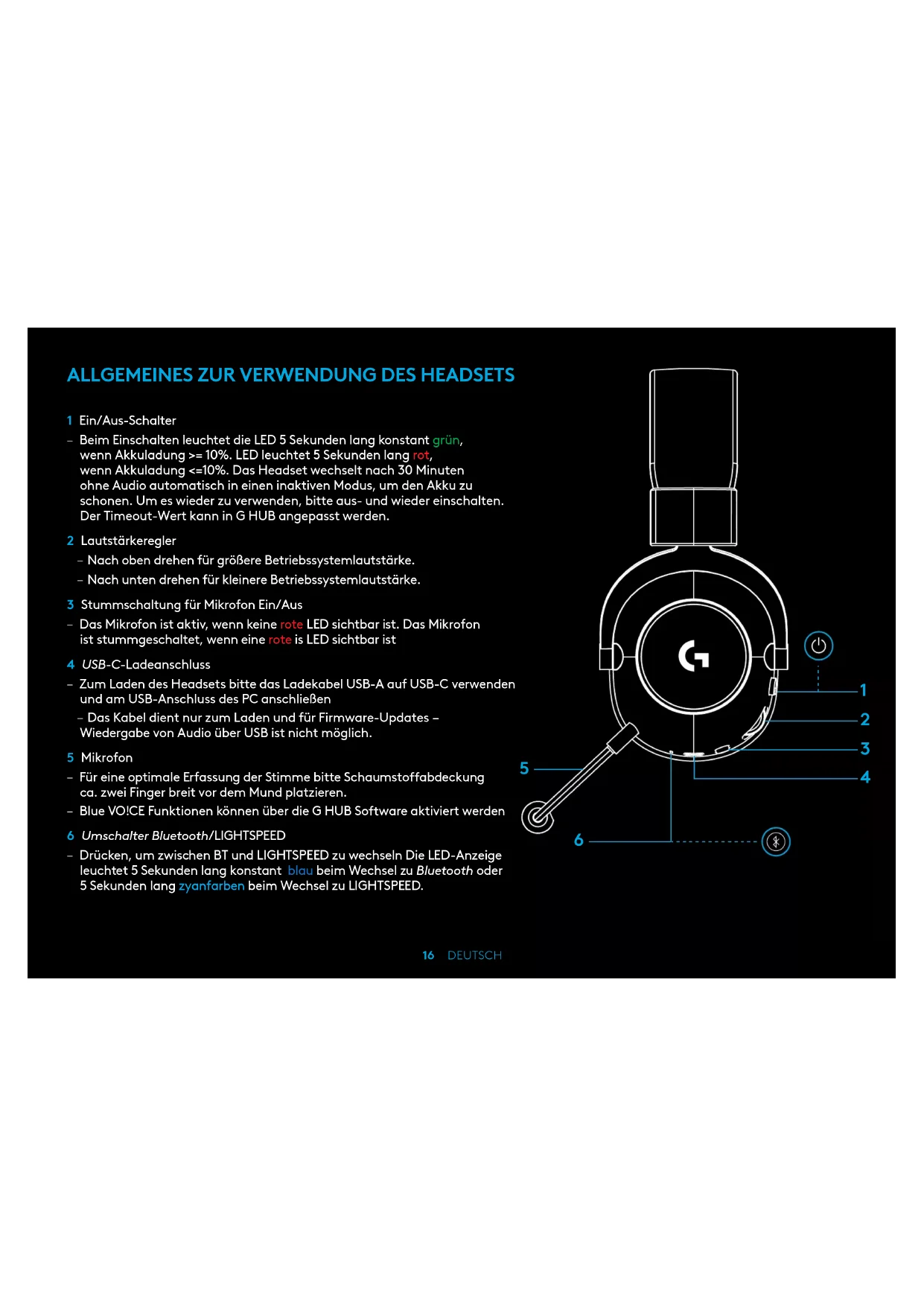 1 Ein/Aus-Schalter – Beim Einschalten leuchtet die LED 5 Sekunden lang konstant grün, wennAkkuladung >= 10%. LED leuchtet 5 Sekunden lang rot, wennAkkuladung <=10%. Das Headset wechselt nach 30 Minuten ohne Audio automatisch in einen inaktiven Modus, um den Akku zu schonen. Umes wieder zu verwenden, bitte aus- und wieder einschalten. DerTimeout-Wert kann in GHUB angepasst werden. 2 Lautstärkeregler – Nach oben drehen für größere Betriebssystemlautstärke. – Nach unten drehen für kleinere Betriebssystemlautstärke. 3 Stummschaltung für Mikrofon Ein/Aus – Das Mikrofon ist aktiv, wenn keine rote LED sichtbar ist. Das Mikrofon iststummgeschaltet, wenn eine rote is LED sichtbar ist 4 USB-C-Ladeanschluss – Zum Laden des Headsets bitte das Ladekabel USB-A auf USB-C verwenden und am USB-Anschluss des PC anschließen – Das Kabel dient nur zum Laden und für Firmware-Updates – Wiedergabevon Audio über USB ist nicht möglich. 5 Mikrofon – Für eine optimale Erfassung der Stimme bitte Schaumstoabdeckung ca.zwei Finger breit vor dem Mund platzieren. – Blue VO!CE Funktionen können über die G HUB Soware aktiviert werden 6 Umschalter Bluetooth/LIGHTSPEED – Drücken, um zwischen BT und LIGHTSPEED zu wechseln Die LED-Anzeige leuchtet 5 Sekunden lang konstant blau beim Wechsel zu Bluetooth oder 5Sekunden lang zyanfarben beim Wechsel zu LIGHTSPEED.
