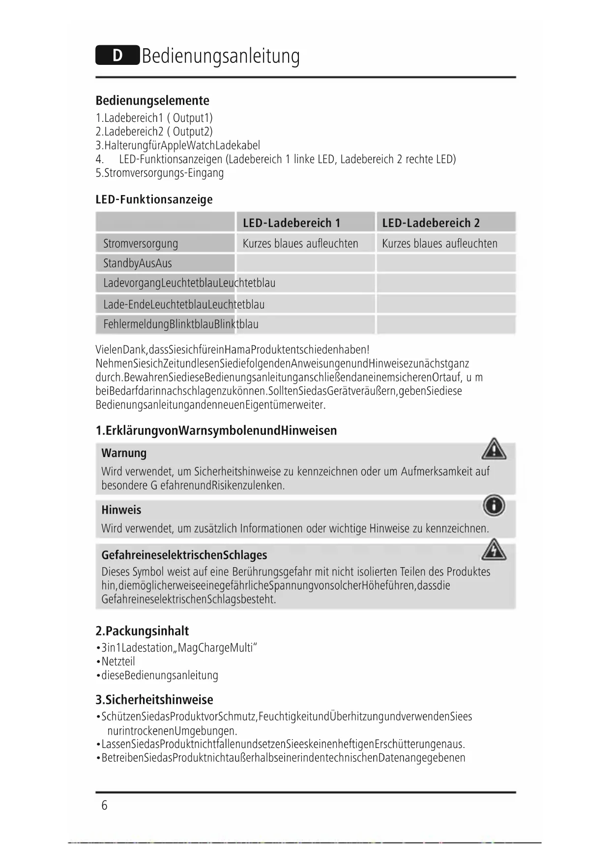 LED-Funktionsanzeige LED-Ladebereich 1LED-Ladebereich 2 Stromversorgung Kurzes blaues aueuchten Kurzes blaues aueuchten Standby Aus Aus Ladevorgang Leuchtet blau Leuchtet blau Lade-Ende Leuchtet blau Leuchtet blau Fehlermeldung Blinkt blau Blinkt blau Vielen Dank, dass Sie sich für ein Hama Produkt entschieden haben! Nehmen Sie sich Zeit und lesen Sie die folgenden Anweisungen und Hinweise zunächst ganz durch. Bewahren Sie diese Bedienungsanleitung anschließend an einem sicheren Ort auf,um bei Bedarf darin nachschlagen zu können. Sollten Sie das Gerät veräußern, geben Sie diese Bedienungsanleitung an den neuen Eigentümer weiter.