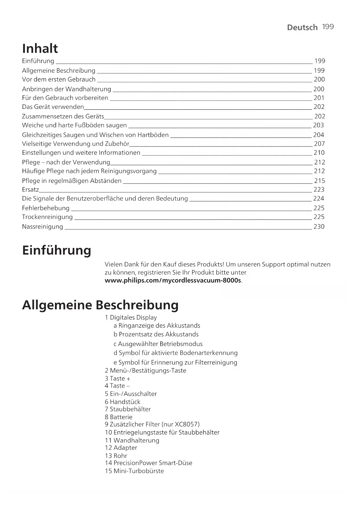 Deutsch Inhalt Einführung ________________________________________________________________________________ 199 Allgemeine Beschreibung ___________________________________________________________________ 199 Vor dem ersten Gebrauch ___________________________________________________________________ 200 Anbringen der Wandhalterung ______________________________________________________________ 200 Für den Gebrauch vorbereiten _______________________________________________________________ 201 Das Gerät verwenden_______________________________________________________________________ 202 Zusammensetzen des Geräts_________________________________________________________________ 202 Weiche und harte Fußböden saugen _________________________________________________________ 203 Gleichzeitiges Saugen und Wischen von Hartböden ____________________________________________ 204 Vielseitige Verwendung und Zubehör_________________________________________________________ 207 Einstellungen und weitere Informationen _____________________________________________________ 210 Pflege – nach der Verwendung_______________________________________________________________ 212 Häufige Pflege nach jedem Reinigungsvorgang ________________________________________________ 212 Pflege in regelmäßigen Abständen ___________________________________________________________ 215 Ersatz_____________________________________________________________________________________ 223 Die Signale der Benutzeroberfläche und deren Bedeutung ______________________________________ 224 Fehlerbehebung ___________________________________________________________________________ 225 Trockenreinigung __________________________________________________________________________ 225 Nassreinigung _____________________________________________________________________________ 230 Einführung Vielen Dank für den Kauf dieses Produkts! Um unseren Support optimal nutzen zu können, registrieren Sie Ihr Produkt bitte unter www.philips.com/mycordlessvacuum-8000s. Allgemeine Beschreibung 1 Digitales Display a Ringanzeige des Akkustands b Prozentsatz des Akkustands c Ausgewählter Betriebsmodus d Symbol für aktivierte Bodenarterkennung e Symbol für Erinnerung zur Filterreinigung 2 Menü-/Bestätigungs-Taste 3 Taste + 4 Taste – 5 Ein-/Ausschalter 6 Handstück 7 Staubbehälter 8 Batterie 9 Zusätzlicher Filter (nur XC8057) 10 Entriegelungstaste für Staubbehälter 11 Wandhalterung 12 Adapter 13 Rohr 14 PrecisionPower Smart-Düse 15 Mini-Turbobürste200 Deutsch 16 Kombinationsdüse 17 Weiche Bürste 18 Polsterdüse 19 Fugendüse 20 Düse des Nass- und Trockensaugers 21 Aqua-Behälter 22 Mikrofaserwischtuch Vor dem ersten Gebrauch Anbringen der Wandhalterung 1 Drehen Sie die Wandhalterung zur Seite und entriegeln Sie den grauen Hebel. Setzen Sie den Ladeanschluss so ein, dass das Metallteil sichtbar ist und aufrecht zur Vorderseite der Wandhalterung weist. 2 Legen Sie das Kabel ordentlich ein, indem Sie es in die dafür vorgesehene Rille stecken. 3 Schließen Sie den grauen Hebel. Stellen Sie sicher, dass der graue Hebel hörbar einrastet. 110 ± 2 cm 4 Befestigen Sie die Wandhalterung sicher an der gewünschten Stelle an der Wand und achten Sie darauf, dass die Schraubenlöcher etwa 110cm vom Boden entfernt sind. Achtung: Seien Sie vorsichtig, wenn Sie Löcher in die Wand bohren, um die Wandhalterung anzubringen. Es besteht das Risiko eines Stromschlags.201 Deutsch Hinweis: Vergewissern Sie sich, dass die Wandhalterung so angebracht ist, dass das gesamte Gerät an der Wand hängen kann, ohne dass die Düse mit dem Boden in Berührung kommt. 5 Sobald Sie die optimale Position und Höhe für die Aufbewahrung und das Aufladen Ihres Geräts ermittelt haben, ziehen Sie die Schrauben fest an, um die Wandhalterung zu befestigen. Für den Gebrauch vorbereiten Das Gerät ist mit einem Lithium-Ionen-Akku ausgestattet. Das vollständige Aufladen des leeren Akkus dauert ca. 6Stunden. 1 Bringen Sie den Akku am Hauptteil des Geräts an. Achten Sie auf eine sichere Verbindung, die durch hörbares Einrasten bestätigt wird. MAX 40⁰C MIN 5⁰C 2 Laden Sie Ihr Gerät auf, indem Sie es in die montierte Wandhalterung schieben. Warnhinweis: Laden Sie das Gerät bei Temperaturen über 5°C und unter 40°C auf. Bewahren Sie es auch in diesem Temperaturbereich auf.202 Deutsch Hinweis: Sie können das Handstück auch auf einer ebenen und stabilen Fläche ablegen und das Ladekabel direkt an das Gerät anschließen.
