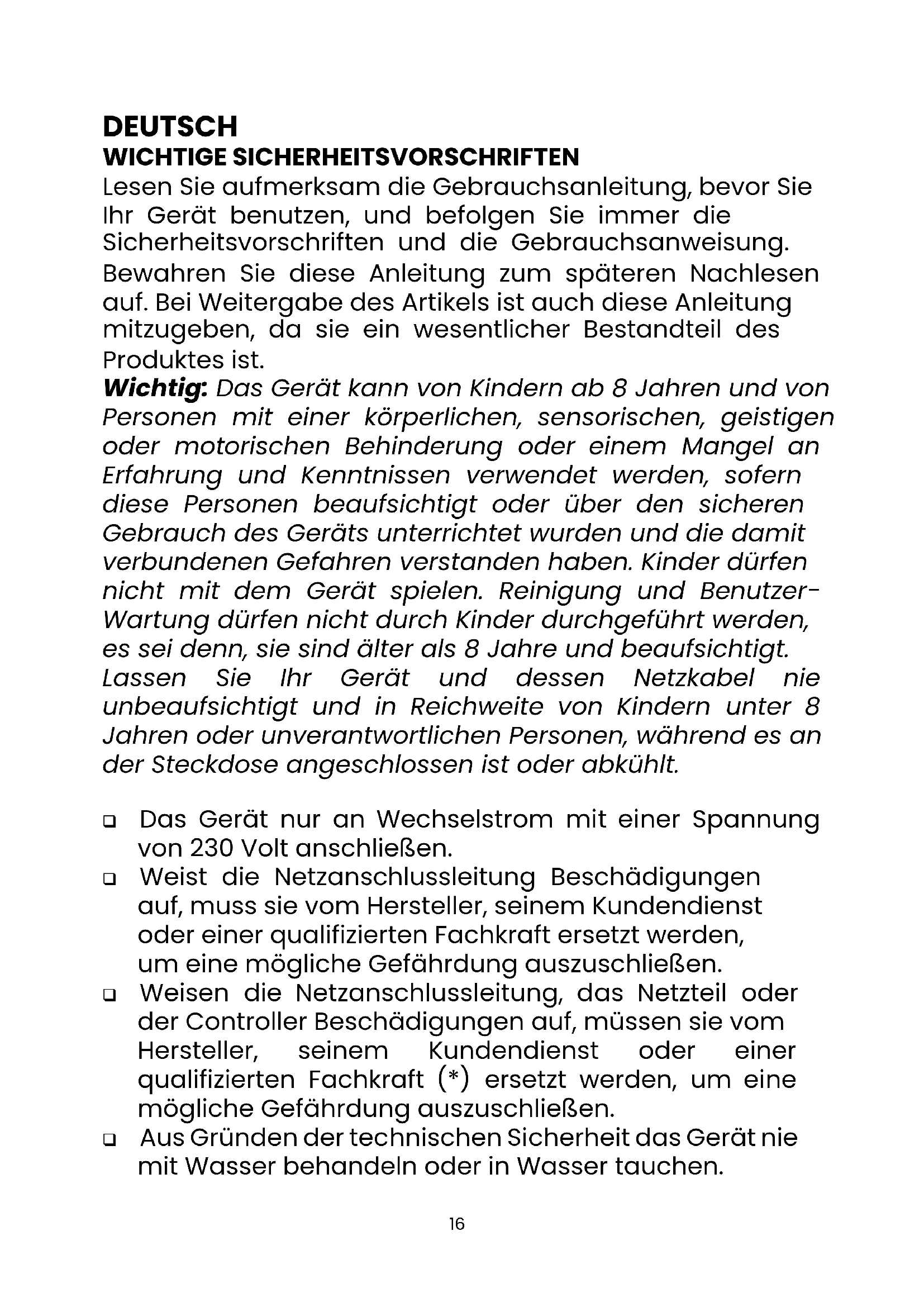 DEUTSCH WICHTIGE SICHERHEITSVORSCHRIFTEN Lesen Sie aufmerksam die Gebrauchsanleitung, bevor Sie Ihr Gerät benutzen, und befolgen Sie immer die Sicherheitsvorschriften und die Gebrauchsanweisung. Bewahren Sie diese Anleitung zum späteren Nachlesen auf. Bei Weitergabe des Artikels ist auch diese Anleitung mitzugeben, da sie ein wesentlicher Bestandteil des Produktes ist. Wichtig: Das Gerät kann von Kindern ab 8 Jahren und von Personen mit einer körperlichen, sensorischen, geistigen oder motorischen Behinderung oder einem Mangel an Erfahrung und Kenntnissen verwendet werden, sofern diese Personen beaufsichtigt oder über den sicheren Gebrauch des Geräts unterrichtet wurden und die damit verbundenen Gefahren verstanden haben. Kinder dürfen nicht mit dem Gerät spielen. Reinigung und Benutzer- Wartung dürfen nicht durch Kinder durchgeführt werden, es sei denn, sie sind älter als 8 Jahre und beaufsichtigt. Lassen Sie Ihr Gerät und dessen Netzkabel nie unbeaufsichtigt und in Reichweite von Kindern unter 8 Jahren oder unverantwortlichen Personen, während es an der Steckdose angeschlossen ist oder abkühlt. ❑ Das Gerät nur an Wechselstrom mit einer Spannung von 230 Volt anschließen. ❑ Weist die Netzanschlussleitung Beschädigungen auf, muss sie vom Hersteller, seinem Kundendienst oder einer qualifizierten Fachkraft ersetzt werden, um eine mögliche Gefährdung auszuschließen. ❑ Weisen die Netzanschlussleitung, das Netzteil oder der Controller Beschädigungen auf, müssen sie vom Hersteller, seinem Kundendienst oder einer qualifizierten Fachkraft (*) ersetzt werden, um eine mögliche Gefährdung auszuschließen. ❑ Aus Gründen der technischen Sicherheit das Gerät nie mit Wasser behandeln oder in Wasser tauchen.17