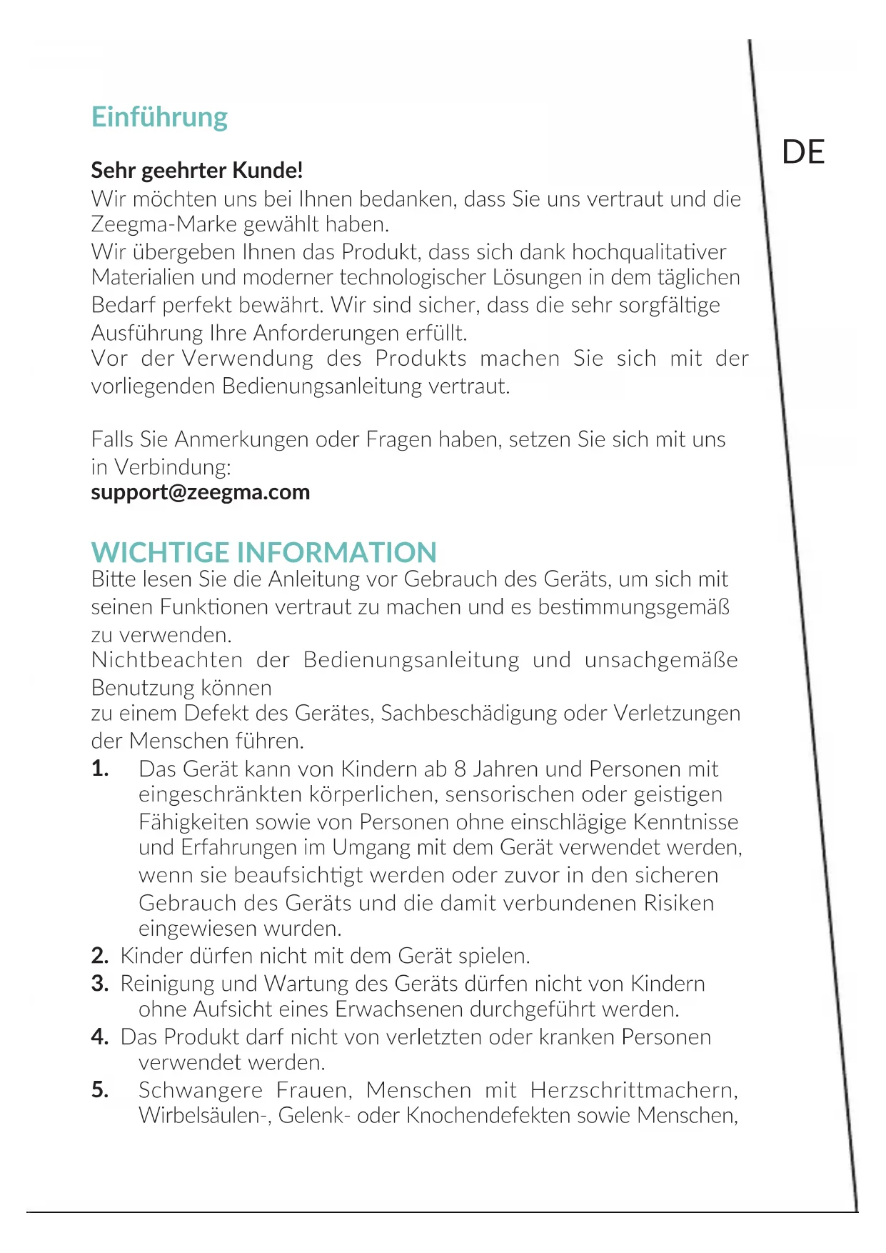 The device should be wiped with a damp cloth and dried thoroughly before the next use. The photos are for reference only, the actual look of the products may dier from the ones shown in the pictures.DE Einführung Sehr geehrter Kunde! Wir möchten uns bei Ihnen bedanken, dass Sie uns vertraut und die Zeegma-Marke gewählt haben. Wir übergeben Ihnen das Produkt, dass sich dank hochqualitaver Materialien und moderner technologischer Lösungen in dem täglichen Bedarf perfekt bewährt. Wir sind sicher, dass die sehr sorgfälge Ausführung Ihre Anforderungen erfüllt. Vor der Verwendung des Produkts machen Sie sich mit der vorliegenden Bedienungsanleitung vertraut. Falls Sie Anmerkungen oder Fragen haben, setzen Sie sich mit uns in Verbindung: support@zeegma.com WICHTIGE INFORMATION Bie lesen Sie die Anleitung vor Gebrauch des Geräts, um sich mit seinen Funkonen vertraut zu machen und es besmmungsgemäß zu verwenden. Nichtbeachten der Bedienungsanleitung und unsachgemäße Benutzung können zu einem Defekt des Gerätes, Sachbeschädigung oder Verletzungen der Menschen führen.