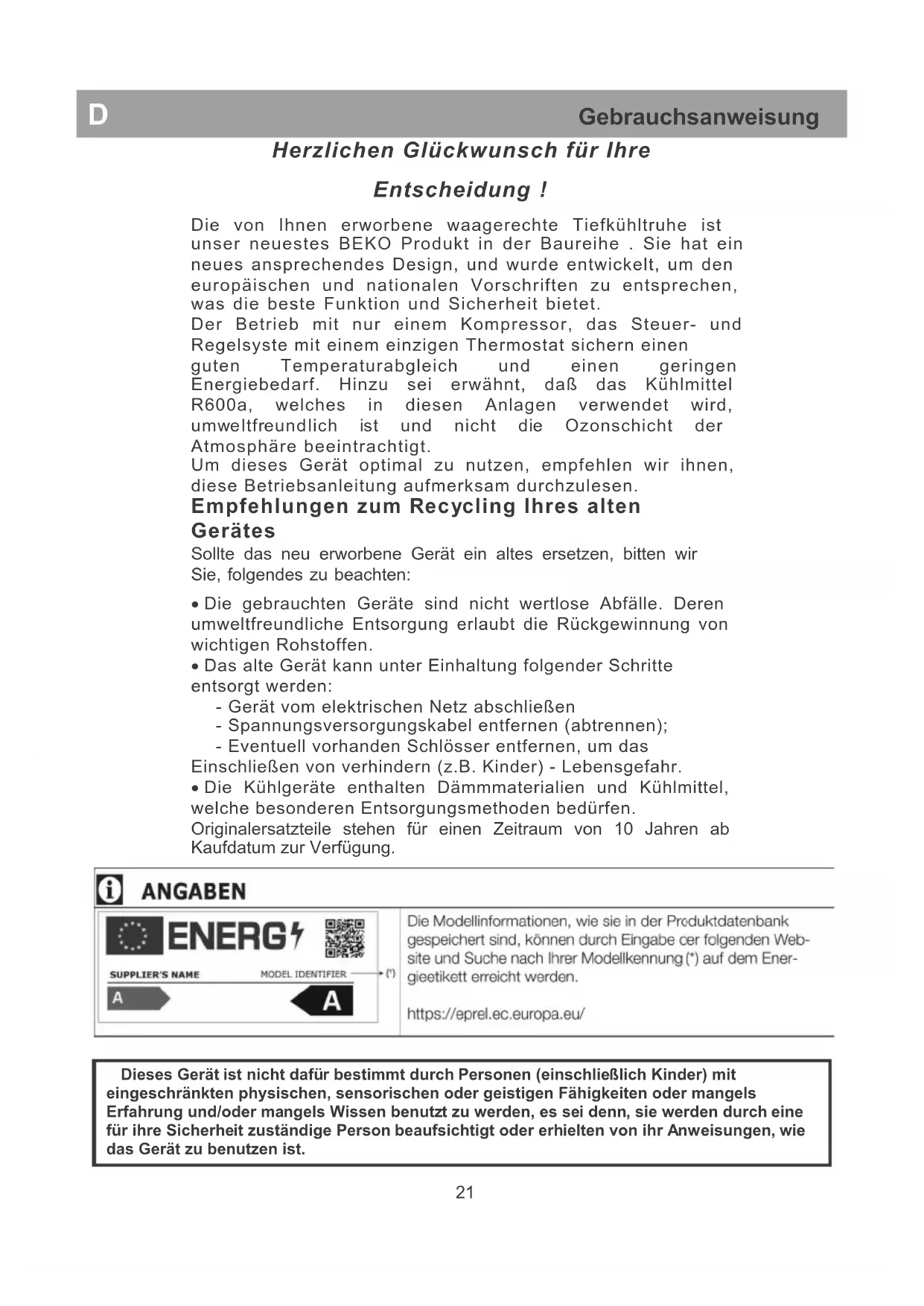 D Gebrauchsanweisung Dieses Gerät ist nicht dafür bestimmt durch Personen (einschließlich Kinder) mit eingeschränkten physischen, sensorischen oder geistigen Fähigkeiten oder mangels Erfahrung und/oder mangels Wissen benutzt zu werden, es sei denn, sie werden durch eine für ihre Sicherheit zuständige Person beaufsichtigt oder erhielten von ihr Anweisungen, wie das Gerät zu benutzen ist.Recycling der Verpackung Vorsicht! Gestatten Sie den Kindern nicht, mit der Verpackung oder mit Teilen der Verpackung zu speilen. Es besteht Erstickungsgefahr durch Wellpapier oder Kunststoffolie. Um eine Beschädigung des Gerätes beim Transport zu verhindern, wurden alle Materialien der Verpackung entsprechend den Vorschriften zur umweltfre undlichen Entsorgung entwickelt. Wir empfehlen die Verwertung der Verpackung, um die Umwelt zu schonen! WICHTIG! Lesen Sie diese Anweisungen vollständig vor der Inbetriebnahme des Gerätes. Sie beinhalten wichtige Informationen zu der Aufstellung, dem Betrieb und der Wartung Ihres Gerätes. Bewahren sie die Gebrauchsanweisungen sicher auf, um auch später leicht zugänglich zu sein, Sie sind auch weiteren Benutzern des Gerätas sehr behilflich. WICHTIG! Dieses Gerät ist nur für die vorgesehenen Zwecke zu bet reiben (Haushalt), in entsprechenden Räumen, vor Regen, Feuchtigkeit oder anderen Umwelteinflüssen geschützt. Transportvorschriften Wir empfehlen, das Gerät auch beim Transport nur in waagerechter Position zu halten. Während dem Transport muß die Verpack ung unbeschädigt sein. Vor der Inbetriebnahme lassen Sie das Gerät für 4 Stunden stehen. Beim Transport sollte jedwelche Einwirkung auf den Kühlkreislauf vermieden werden (Gefahr von Verformungen an den Leitungen). Die Nicheinhaltung dieser Vorschriften kann zu Schäden an dem Motorkompressor führen und zum Erlöschen der Gewährleistung für das Gerät.