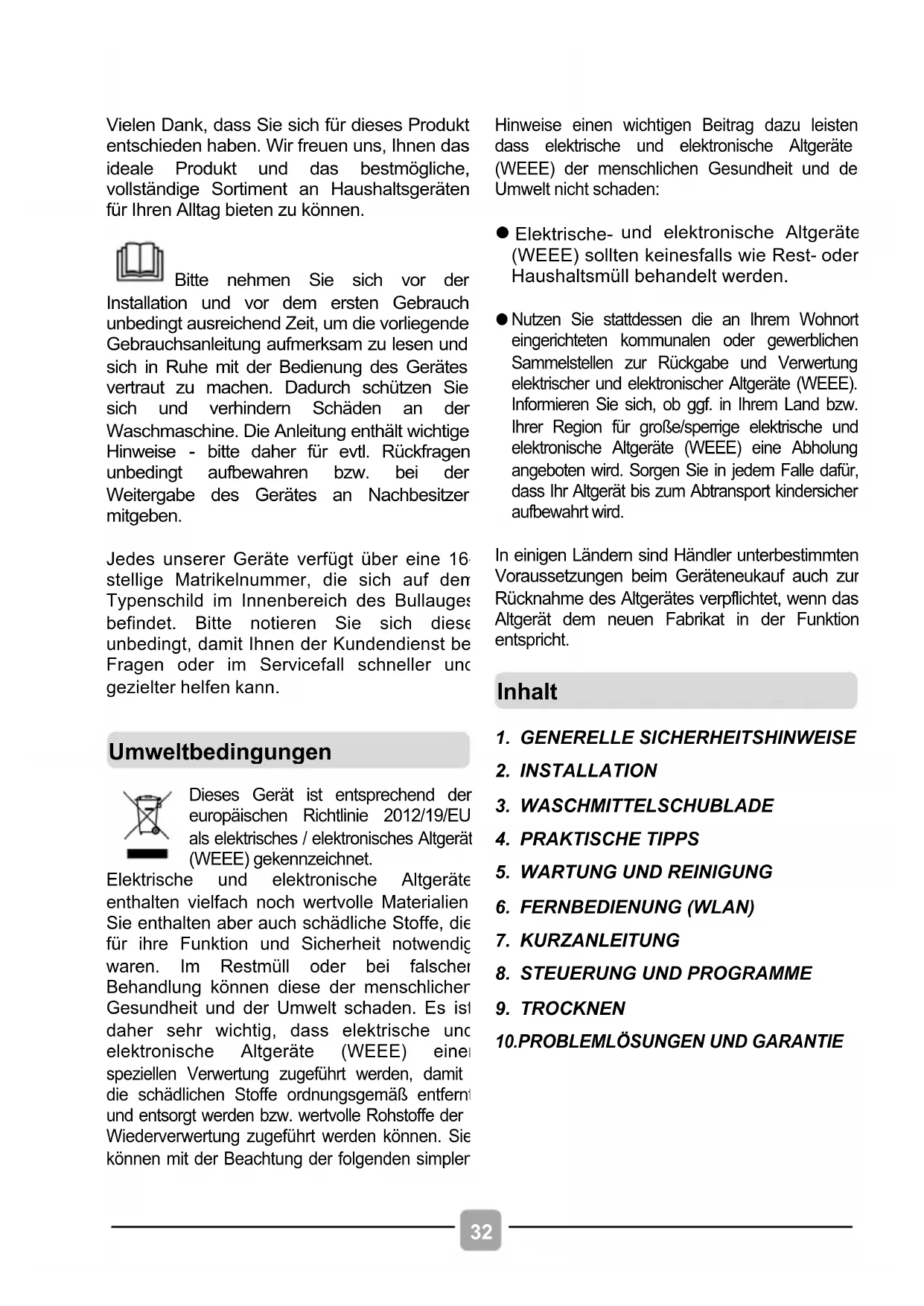 Bitte nehmen Sie sich vor der Installation und vor dem ersten Gebrauch unbedingt ausreichend Zeit, um die vorliegende Gebrauchsanleitung aufmerksam zu lesen und sich in Ruhe mit der Bedienung des Gerätes vertraut zu machen. Dadurch schützen Sie sich und verhindern Schäden an der Waschmaschine. Die Anleitung enthält wichtige Hinweise