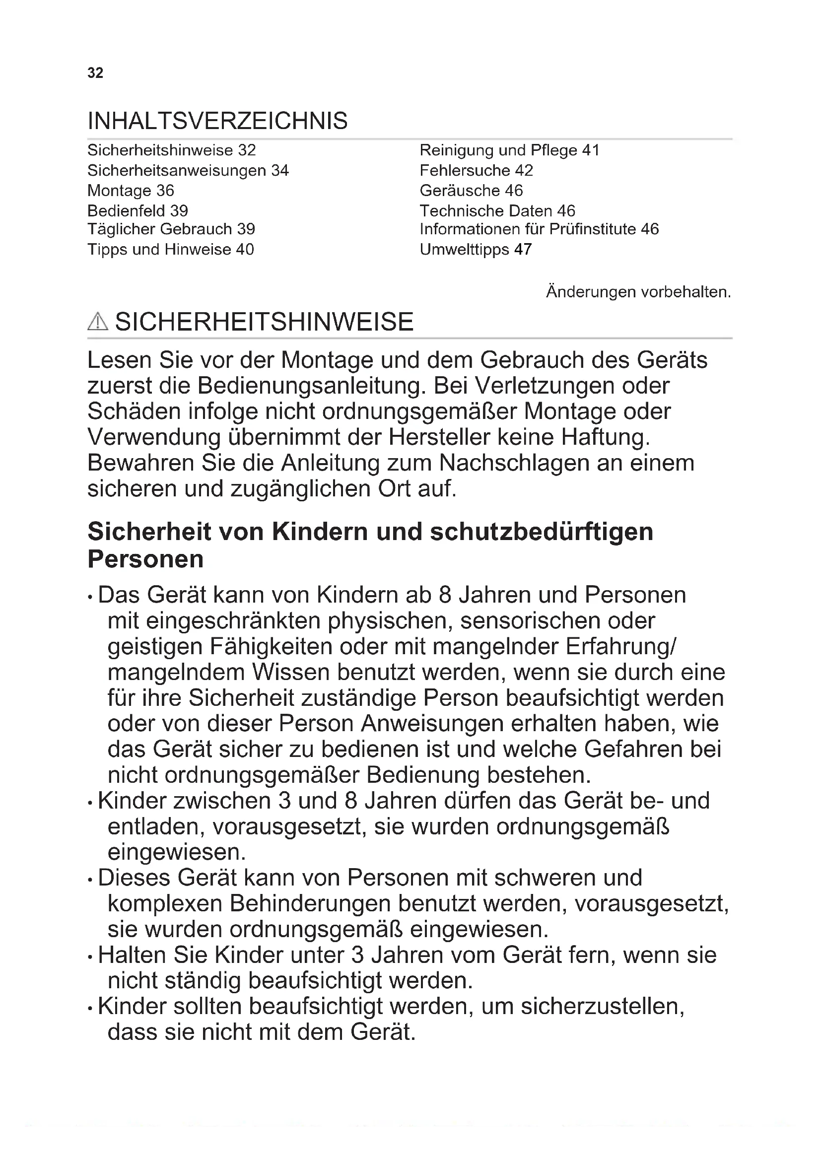 - Kinder zwischen 3 und 8 Jahren dürfen das Gerät be- und entladen, vorausgesetzt, sie wurden ordnungsgemäß eingewiesen.