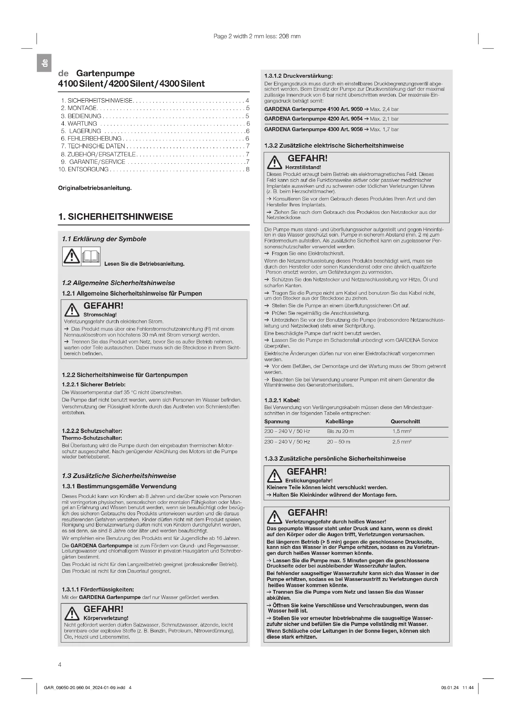 Laden Sie die Anleitung für Ihr Wasserpumpe kostenlos im PDF-Format! Finden Sie Ihr Handbuch 4200 Silent - GARDENA und nehmen Sie Ihr elektronisches Gerät wieder in die Hand. Auf dieser Seite sind alle Dokumente veröffentlicht, die für die Verwendung Ihres Geräts notwendig sind. 4200 Silent von der Marke GARDENA.
