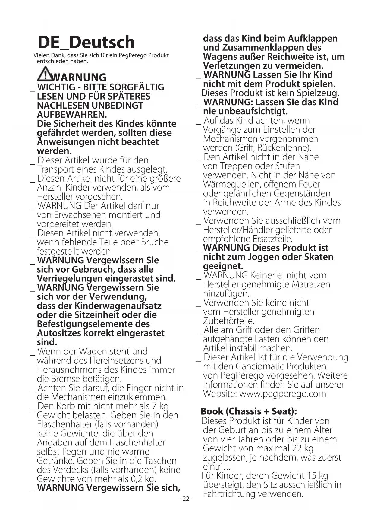 NACHLESEN UNBEDINGT AUFBEWAHREN. Die Sicherheit des Kindes könnte gefährdet werden, sollten diese Anweisungen nicht beachtet werden. _ Dieser Artikel wurde für den Transport eines Kindes ausgelegt. _ Diesen Artikel nicht für eine größere Anzahl Kinder verwenden, als vom Hersteller vorgesehen. _ WARNUNG Der Artikel darf nur von Erwachsenen montiert und vorbereitet werden. _ Diesen Artikel nicht verwenden, wenn fehlende Teile oder Brüche festgestellt werden. _ WARNUNG Vergewissern Sie sich vor Gebrauch, dass alle Verriegelungen eingerastet sind. _ WARNUNG Vergewissern Sie sich vor der Verwendung, dass der Kinderwagenaufsatz oder die Sitzeinheit oder die Befestigungselemente des Autositzes korrekt eingerastet sind. _ Wenn der Wagen steht und während des Hereinsetzens und Herausnehmens des Kindes immer die Bremse betätigen. _ Achten Sie darauf, die Finger nicht in die Mechanismen einzuklemmen. _ Den Korb mit nicht mehr als 7 kg Gewicht belasten. Geben Sie in den Flaschenhalter (falls vorhanden) keine Gewichte, die über den Angaben auf dem Flaschenhalter selbst liegen und nie warme Getränke. Geben Sie in die Taschen des Verdecks (falls vorhanden) keine Gewichte von mehr als 0,2 kg. _ WARNUNG Vergewissern Sie sich, dass das Kind beim Aufklappen und Zusammenklappen des Wagens außer Reichweite ist, um Verletzungen zu vermeiden. _ WARNUNG Lassen Sie Ihr Kind nicht mit dem Produkt spielen. Dieses Produkt ist kein Spielzeug. _ WARNUNG: Lassen Sie das Kind nie unbeaufsichtigt. _ Auf das Kind achten, wenn Vorgänge zum Einstellen der Mechanismen vorgenommen werden (Griff, Rückenlehne). _ Den Artikel nicht in der Nähe von Treppen oder Stufen verwenden. Nicht in der Nähe von Wärmequellen, offenem Feuer oder gefährlichen Gegenständen in Reichweite der Arme des Kindes verwenden. _ Verwenden Sie ausschließlich vom Hersteller/Händler gelieferte oder empfohlene Ersatzteile. _ WARNUNG Dieses Produkt ist nicht zum Joggen oder Skaten geeignet. _ WARNUNG Keinerlei nicht vom Hersteller genehmigte Matratzen hinzufügen. _ Verwenden Sie keine nicht vom Hersteller genehmigten Zubehörteile. _ Alle am Griff oder den Griffen aufgehängte Lasten können den Artikel instabil machen. _ Dieser Artikel ist für die Verwendung mit den Ganciomatic Produkten von PegPerego vorgesehen. Weitere Informationen finden Sie auf unserer Website: www.pegperego.com Book (Chassis + Seat): Dieses Produkt ist für Kinder von der Geburt an bis zu einem Alter von vier Jahren oder bis zu einem Gewicht von maximal 22 kg zugelassen, je nachdem, was zuerst eintritt. Für Kinder, deren Gewicht 15kg übersteigt, den Sitz ausschließlich in Fahrtrichtung verwenden.- 23 - _ WARNUNG: Verwenden Sie immer das Rückhaltesystem. Stets den 5-Punkte- Sicherheitsgurt verwenden. Befestigen Sie immer den Bauchgurt am Schrittgurt. _ Der Rückhaltebügel ist nicht darauf ausgelegt, dem Gewicht des Kindes standzuhalten. Er ist nicht darauf ausgelegt, den Wagen mit dem darin sitzenden Kind anzuheben. Der Rückhaltebügel ersetzt nicht den Sicherheitsgurt. _ Für Neugeborene wird empfohlen, die Rückenlehne vollkommen nach unten zu neigen. _ WARNUNG: Den Regenschutz (wenn vorhanden) nicht in geschlossenen Räumen verwenden und stets kontrollieren, dass dem Kind nicht zu warm ist. Nie in der Nähe von Wärmequellen abstellen und auf brennende Zigaretten achten. Der Regenschutz darf auf einem Buggy nicht ohne Verdeck oder Sonnenschutz verwendet werden, an denen er befestigt werden kann. Verwenden Sie den Regenschutz nur unter Beaufsichtigung durch einen Erwachsenen. Vergewissern Sie sich, dass der Regenschutz keinerlei bewegliche Mechanismen des Gestells oder des Buggys behindert und denken Sie immer daran, ihn zu entfernen, bevor Sie das Gestell oder den Buggy zusammenklappen. Book Chassis + Autokindersitz: Für Kinder ab der Geburt bis zu einem Gewicht von 13kg zugelassen. Zusammen mit dem Autokindersitz verwendet stellt dieser Artikel keinen Ersatz für einen Kinderwagen oder ein Kinderbett dar. Das Kind sollte daher zum Schlafen flach in einen Kinderwagen, in eine Wiege oder ein Bettchen gelegt werden. Book Chassis + Kinderwagenwanne: Für Kinder ab der Geburt bis zu einem Gewicht von 9 kg zugelassen. Bei Verwendung mit dem Wagengestell: Dieses Produkt ist für Kinder zugelassen, die noch nicht in der Lage sind, sich allein aufzusetzen, sich umzudrehen und sich auf Händen und Füßen zu halten und bis zu einem Gewicht von maximal 9 kg. Während der Verwendung des Kinderwagens müssen alle Transportgriffe (wenn vorhanden) außerhalb des Kinderwagens und der Reichweite des Kindes positioniert werden. Die Abbildungen in Bezug auf die Textildetails können von der gekauften Kollektion abweichen. Weitere Informationen finden Sie auf unserer Website: www.pegperego.com GERAUCHSANWEISUNG BOOK CHASSIS 1 ÖFFNEN: Vor dem Öffnen des Rahmens alle Kartonteile entfernen, wo vorhanden (ohne Klingen zu verwenden). WARNUNG: