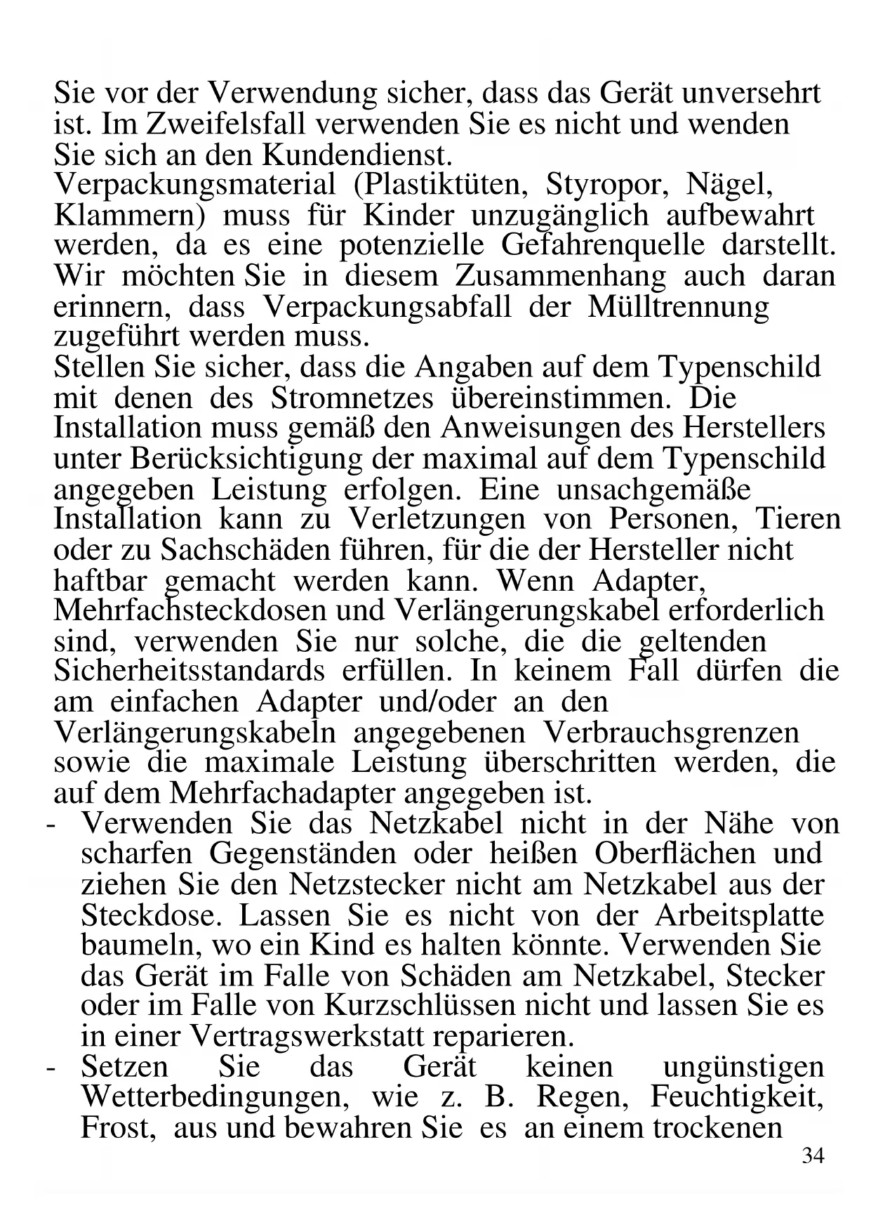 DEUTSCH: HINWEISE: Verwenden Sie das Gerät nur nach den Anweisungen in dieser Bedienungsanleitung. Jede anderweitige Verwendung gilt als unsachgemäß und gefährlich, und der Hersteller kann für Schäden nicht haftbar gemacht werden, die durch eine unsachgemäße, falsche oder unvernünftige Verwendung verursacht werden. Stellen34 Sie vor der Verwendung sicher, dass das Gerät unversehrt ist. Im Zweifelsfall verwenden Sie es nicht und wenden Sie sich an den Kundendienst. Verpackungsmaterial (Plastiktüten, Styropor, Nägel, Klammern) muss für Kinder unzugänglich aufbewahrt werden, da es eine potenzielle Gefahrenquelle darstellt. Wir möchten Sie in diesem Zusammenhang auch daran erinnern, dass Verpackungsabfall der Mülltrennung zugeführt werden muss. Stellen Sie sicher, dass die Angaben auf dem Typenschild mit denen des Stromnetzes übereinstimmen. Die Installation muss gemäß den Anweisungen des Herstellers unter Berücksichtigung der maximal auf dem Typenschild angegeben Leistung erfolgen. Eine unsachgemäße Installation kann zu Verletzungen von Personen, Tieren oder zu Sachschäden führen, für die der Hersteller nicht haftbar gemacht werden kann. Wenn Adapter, Mehrfachsteckdosen und Verlängerungskabel erforderlich sind, verwenden Sie nur solche, die die geltenden Sicherheitsstandards erfüllen. In keinem Fall dürfen die am einfachen Adapter und/oder an den Verlängerungskabeln angegebenen Verbrauchsgrenzen sowie die maximale Leistung überschritten werden, die auf dem Mehrfachadapter angegeben ist. - Verwenden Sie das Netzkabel nicht in der Nähe von scharfen Gegenständen oder heißen Oberflächen und ziehen Sie den Netzstecker nicht am Netzkabel aus der Steckdose. Lassen Sie es nicht von der Arbeitsplatte baumeln, wo ein Kind es halten könnte. Verwenden Sie das Gerät im Falle von Schäden am Netzkabel, Stecker oder im Falle von Kurzschlüssen nicht und lassen Sie es in einer Vertragswerkstatt reparieren. - Setzen Sie das Gerät keinen ungünstigen Wetterbedingungen, wie z. B. Regen, Feuchtigkeit, Frost, aus und bewahren Sie es an einem trockenen35 Ort auf. Fassen Sie das Gerät nicht mit nassen Händen an und verwenden Sie es nicht barfuß. - Dieses Gerät kann von Kindern ab 8 Jahren und von Personen mit eingeschränkten körperlichen, sensorischen oder geistigen Fähigkeiten oder mangelnder Erfahrung und Kenntnissen verwendet werden, wenn sie beaufsichtigt oder instruiert wurden, um das Gerät sicher zu verwenden und die damit verbundenen Gefahren zu verstehen. Kinder dürfen nicht mit dem Gerät spielen. Reinigung und Benutzerwartung dürfen nicht von Kindern ohne Aufsicht durchgeführt werden. - Kinder dürfen nicht mit dem Gerät spielen. - Bewahren Sie das Gerät und sein Netzanschluss außerhalb der Reichweite von Kinder unter 8 Jahren. Wenn das Netzkabel beschädigt ist oder wenn ein Fehler vorliegt, darf das Gerät nicht manipuliert werden. Jede Reparatur muss vom Hersteller oder seinem technischen Kundendienst oder in jedem Fall von einer Person mit ähnlicher Qualifikation durchgeführt werden, um jegliches Risiko zu vermeiden. Die Nichtbeachtung der vorstehenden Bestimmungen kann die Sicherheit des Geräts beeinträchtigen und die Garantiebedingungen ungültig machen. WARNUNG: Dieses Gerät enthält eine Heizfunktion. Oberflächen, außer die funktionellen Oberflächen können hohe Temperaturen entwickeln. Da die Temperaturen von verschiedene Personen unterschiedlich wahrgenommen werden, sollte dieses Gerät mit VORSICHT verwendet werden. Halten Sie das Gerät ausschließlich auf Griffflächen die abhalten und verwenden Sie solche Hitzeschutzmaßen. Dieses Gerät ist nur für den Hausgebrauch oder gleichwertiges bestimmt, in Situationen wie bspw.: Kantinen in kleinen Firmen oder ähnliche36 Arbeitsumgebungen, von Kunden in Hotels, Motels oder andere Art von touristische Unterkunft, wie ländlicher oder Wohn –Tourismus. Das Gerät darf nicht mit einer Zeitschaltuhr oder mit einem separaten Fernwirksystem betrieben werden Führen Sie vor jedem Gebrauch das Netzkabel aus. Setzen Sie das Produkt keinen Stößen aus, es könnte beschädigt werden. Verwenden Sie nur originale und kompatible Teile und Zubehör. Halten Sie das Gerät fern von brennbaren Materialien, Wärmequellen, Dampf-und kalte Zonen. ALLGEMEINE INFORMATIONEN Die Oberflächen des Geräts dürfen nicht gegen eine Wand gestellt werden. Lassen Sie mindestens 10 cm freien Platz auf der Rückseite und den Seiten und 10 cm freien Platz über dem Gerät. Das Gerät wird während des Gebrauchs sehr heiß. Berühren Sie niemals das Glas oder das Innere des Geräts, sondern nur die Griffe und das Bedienfeld. Verwenden Sie immer Topflappen, um das Zubehör zu entfernen. Stellen Sie nichts auf der Tür, wenn diese geöffnet ist, da die Tür beschädigt sein kann oder der Ofen kann kippen und brechen. Das Gerät benötigt ca. 30 Minuten zum Abkühlen um es sicher zu handhaben oder zu reinigen. Waschen sie nicht oder werfen Sie kein Wasser auf dem Glas, wenn es heiß ist, da es brechen kann. Stellen Sie nichts auf das Gerät. Bewegen Sie den Ofen nicht, wenn er heiß ist oder Lebensmittel enthält. Stellen Sie Lebensmittel nur auf die mitgelieferten Tabletts und Zubehörteile, damit diese das Heizelement nicht berühren. Füllen Sie die Schalen nicht mit Öl, da dies zu einer Brandgefahr führen kann Behandeln Sie vorsichtig gekochte Lebensmittel um37 eine Verbrennungsgefahr zu vermeiden. Lassen Sie das Gerät während des Betriebs niemals unbeaufsichtigt. Entfernen Sie den Stecker nach jedem Gebrauch. Stellen Sie den Ofen nicht in Wasser oder andere Flüssigkeiten und vermeiden Sie das Verspritzen von Flüssigkeiten auf das Gerät. Während des Betriebs wird heißer Dampf durch die Luftauslassöffnungen freigesetzt. Halten Sie Ihre Hände und Ihr Gesicht in sicherem Abstand vom Luftauslass. Achten Sie auch auf heißen Dampf, wenn Sie die Tür nach dem Kochen öffnen. Entrollen Sie das Stromkabel vor jedem 