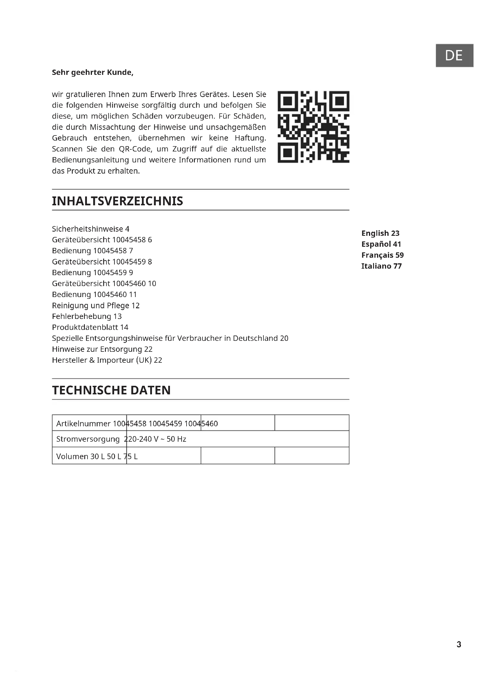 Sehr geehrter Kunde, wir gratulieren Ihnen zum Erwerb Ihres Gerätes. Lesen Sie die folgenden Hinweise sorgfältig durch und befolgen Sie diese, um möglichen Schäden vorzubeugen. Für Schäden, die durch Missachtung der Hinweise und unsachgemäßen Gebrauch entstehen, übernehmen wir keine Haftung. Scannen Sie den QR-Code, um Zugriff auf die aktuellste Bedienungsanleitung und weitere Informationen rund um das Produkt zu erhalten. INHALTSVERZEICHNIS Sicherheitshinweise 4 Geräteübersicht 10045458 6 Bedienung 10045458 7 Geräteübersicht 10045459 8 Bedienung 10045459 9 Geräteübersicht 10045460 10 Bedienung 10045460 11 Reinigung und Pege 12 Fehlerbehebung 13 Produktdatenblatt 14 Spezielle Entsorgungshinweise für Verbraucher in Deutschland 20 Hinweise zur Entsorgung 22 Hersteller & Importeur (UK) 22 TECHNISCHE DATEN Artikelnummer 10045458 10045459 10045460 Stromversorgung 220-240 V ~ 50 Hz Volumen 30 L 50 L 75 L English 23 Español 41 Français 59 Italiano 77 Nederlands4