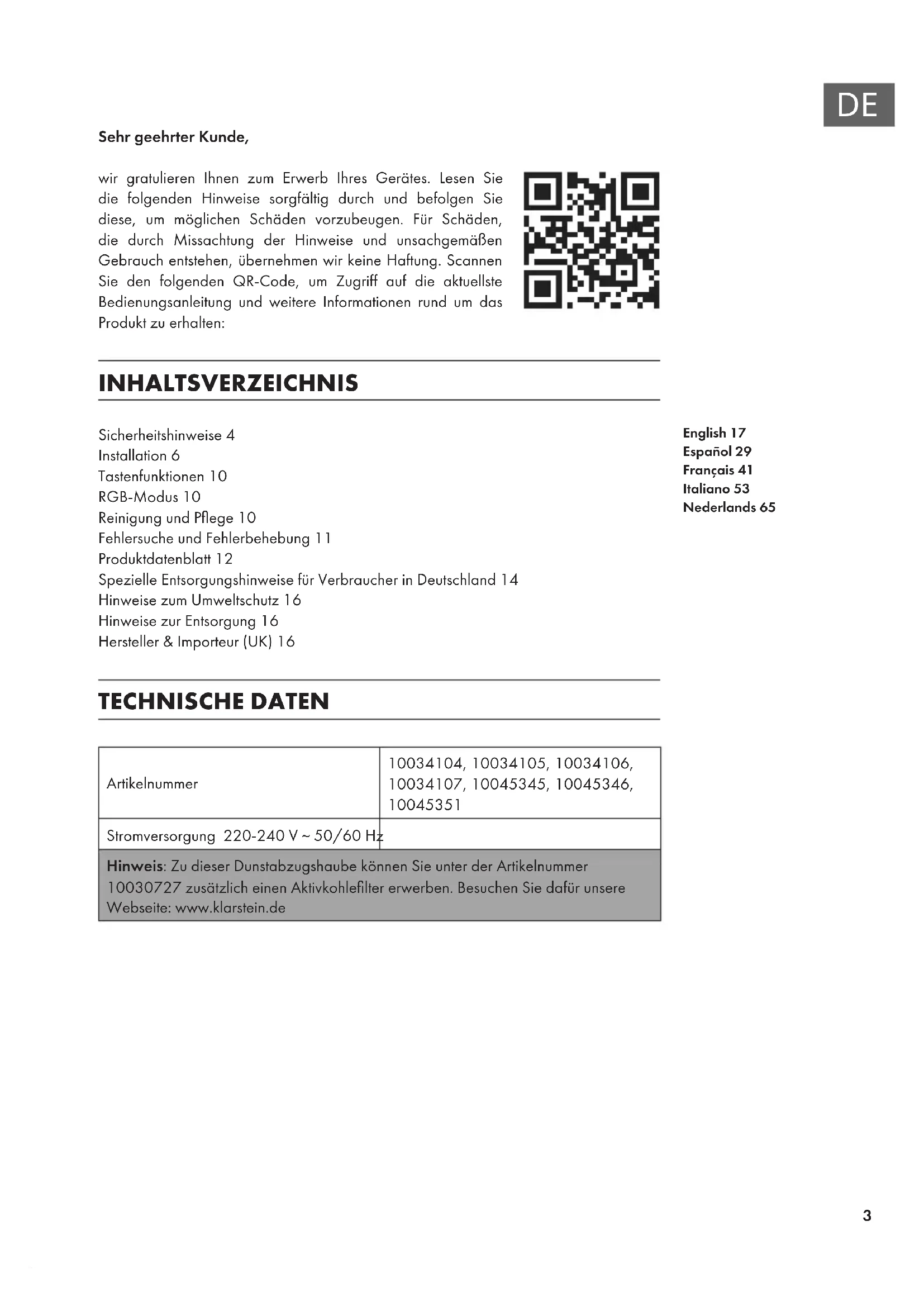 Sehr geehrter Kunde, wir gratulieren Ihnen zum Erwerb Ihres Gerätes. Lesen Sie die folgenden Hinweise sorgfältig durch und befolgen Sie diese, um möglichen Schäden vorzubeugen. Für Schäden, die durch Missachtung der Hinweise und unsachgemäßen Gebrauch entstehen, übernehmen wir keine Haftung. Scannen Sie den folgenden QR-Code, um Zugriff auf die aktuellste Bedienungsanleitung und weitere Informationen rund um das Produkt zu erhalten: INHALTSVERZEICHNIS Sicherheitshinweise4 Installation6 Tastenfunktionen10 RGB-Modus10 Reinigung und Pege10 Fehlersuche und Fehlerbehebung11 Produktdatenblatt12 Spezielle Entsorgungshinweise für Verbraucher in Deutschland14 Hinweise zum Umweltschutz16 Hinweise zur Entsorgung16 Hersteller & Importeur (UK)16 TECHNISCHE DATEN Artikelnummer 10034104, 10034105, 10034106, 10034107, 10045345, 10045346,