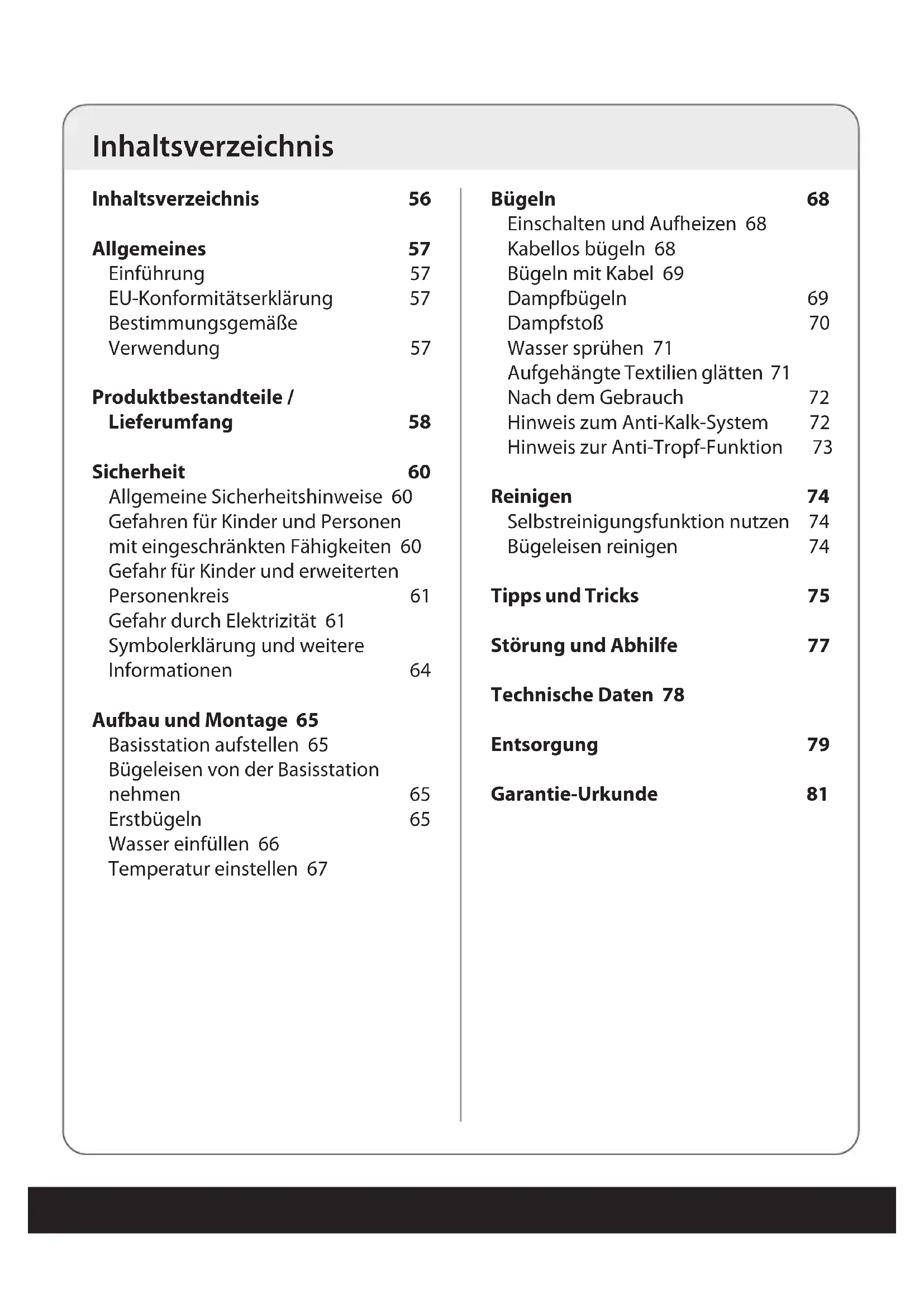 - bei Gewitter. - Ziehen Sie dabei immer am Stecker, nicht am Kabel. - Nehmen Sie keine Verän- derungen an dem Gerät oder an der Netzanschluss- leitung vor. Lassen Sie Reparaturen nur von einer Fachwerkstatt durchführen, da nicht fachgerecht repa- rierte Geräte den Benutzer gefährden. Beachten Sie auch die beiliegenden Garantiebedingungen. - Netzanschlussleitung nicht um das Gerät oder Teile des Gerätes wickeln. Durch fehlerhaftes Aufwickeln kann die Kabelisolation beschädigt werden und es besteht Stromschlaggefahr.6362 Gefahr von Verbrennungen/ Verbrühungen und Brand - Die Bügelsohle wird während des Gebrauches sehr heiß. Berühren Sie sie nicht und fassen Sie das Bügeleisen aus- schließlich am Griff an. Bügeln Sie Ihre Kleidung oder andere Textilien niemals am Körper. - Der austretende Dampf ist sehr heiß. Vermeiden Sie mit dem Dampf in Berührung zu kommen. Richten Sie Bügel- sohle und Dampfstoß niemals auf Menschen und Tiere. - Stellen Sie das Bügeleisen nie mit der heißen Bügel- sohle nach unten auf einen Tisch, eine Arbeitsplatte o. ä. Stellen Sie das Bügeleisen immer auf seinen Abstellfuß oder die dafür vorgesehene und geeignete Abstellflä- che Ihres Bügelbrettes. - Lassen Sie das Gerät nicht unbeaufsichtigt, wenn es sich aufheizt oder noch abkühlt. - Lassen Sie das Bügelei- sen vollständig abküh- len, bevor Sie es reinigen oder wegpacken. Warnung vor Verletzungen sonstiger Ursache - Achten Sie darauf, dass die Netzanschlussleitung keine Stolpergefahr darstellt. Vorsicht - Sachschäden - Bügeln Sie mit dem Bügel- eisen nur Textilien, die dafür vorgesehen und geeignet sind. Wenn Sie sich unsi- cher sind, ob die Textilie für die gewählten Einstellun- gen geeignet ist, bügeln Sie zunächst an einer nicht sichtbaren Stelle zur Probe. - Stellen Sie das Bügeleisen immer so ab, dass es nicht herunterfallen kann. Stellen Sie es dabei immer auf seinen Abstellfuß, auf die Basissta- tion oder die dafür vorgese- hene und geeignete Abstell- fläche Ihres Bügelbrettes. - Wickeln Sie die Netzan- schlussleitung niemals um die Bügelsohle. - Beachten Sie die Hinweise und Symbole in den zu bü- gelnden Textilien. Die Symbo- le auf dem Temperaturregler entsprechen den marktüb- lichen Pflege-Symbolen.6564 6564 - Reinigen Sie das Bügeleisen nicht mit Metallschwäm- men, scheuernden oder kratzenden Reinigungs- mitteln. Diese könnten die Bügelsohle beschädigen. Symbolerklärung und weitere Informationen Die folgenden Symbole und Signalworte werden in dieser Bedienungs- anleitung, auf dem Gerät und/oder auf der Verpackung verwendet oder dienen zur Darstellung von zusätzlichen Informationen. Bedienungsanleitung lesen und beachten! Wichtige Warnhinweise sind mit diesem Symbol gekennzeichnet. Gefahr – bezieht sich auf Personenschäden Achtung – bezieht sich auf Sachschäden Wichtige Informationen sind mit diesem Symbol gekennzeichnet. Vorsicht! Heiße Oberäche! Dieses Symbol signalisiert besondere Vorschriften zur Entsorgung von Altgeräten (siehe Kapitel „Entsorgung“).6564 6564 Aufbau und Montage Basisstation aufstellen