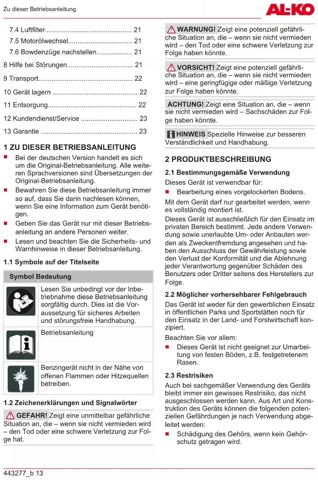 Verpackung, Gerät und Zubehör sind aus recyclingfähigen Materialien hergestellt und entsprechend zu entsorgen.443277_b 23 Kundendienst/Service 12 KUNDENDIENST/SERVICE Bei Fragen zu Garantie, Reparatur oder Ersatz- teilen wenden Sie sich bitte an Ihre nächstgele- gene AL-KOServicestelle. Diese finden Sie im Internet unter folgender Adresse: www.al-ko.com/service-contacts 13 GARANTIE Etwaige Material- oder Herstellungsfehler am Gerät beseitigen wir während der gesetzlichen Verjäh- rungsfrist für Mängelansprüche entsprechend unserer Wahl durch Reparatur oder Ersatzlieferung. Die Verjährungsfrist bestimmt sich jeweils nach dem Recht des Landes, in dem das Gerät gekauft wurde. Unsere Garantiezusage gilt nur bei: