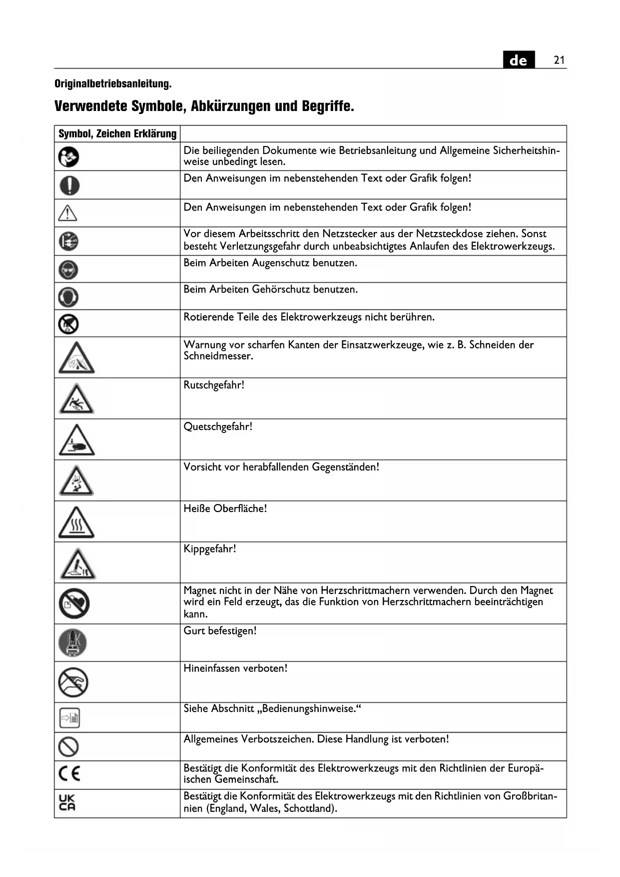 Originalbetriebsanleitung.Übersetzung der Originalbetriebsanleitung. Verwendete Symbole, Abkürzungen und Begriffe. Symbol, Zeichen Erklärung Die beiliegenden Dokumente wie Betriebsanleitung und Allgemeine Sicherheitshin- weise unbedingt lesen. Den Anweisungen im nebenstehenden Text oder Grafik folgen! Den Anweisungen im nebenstehenden Text oder Grafik folgen! Vor diesem Arbeitsschritt den Netzstecker aus der Netzsteckdose ziehen. Sonst besteht Verletzungsgefahr durch unbeabsichtigtes Anlaufen des Elektrowerkzeugs. Beim Arbeiten Augenschutz benutzen. Beim Arbeiten Gehörschutz benutzen. Rotierende Teile des Elektrowerkzeugs nicht berühren. Warnung vor scharfen Kanten der Einsatzwerkzeuge, wie z. B. Schneiden der Schneidmesser. Rutschgefahr! Quetschgefahr! Vorsicht vor herabfallenden Gegenständen! Heiße Oberfläche! Kippgefahr! Magnet nicht in der Nähe von Herzschrittmachern verwenden. Durch den Magnet wird ein Feld erzeugt, das die Funktion von Herzschrittmachern beeinträchtigen kann. Gurt befestigen! Hineinfassen verboten! Siehe Abschnitt „Bedienungshinweise.“ Allgemeines Verbotszeichen. Diese Handlung ist verboten! Bestätigt die Konformität des Elektrowerkzeugs mit den Richtlinien der Europä- ischen Gemeinschaft. Bestätigt die Konformität des Elektrowerkzeugs mit den Richtlinien von Großbritan- nien (England, Wales, Schottland).22