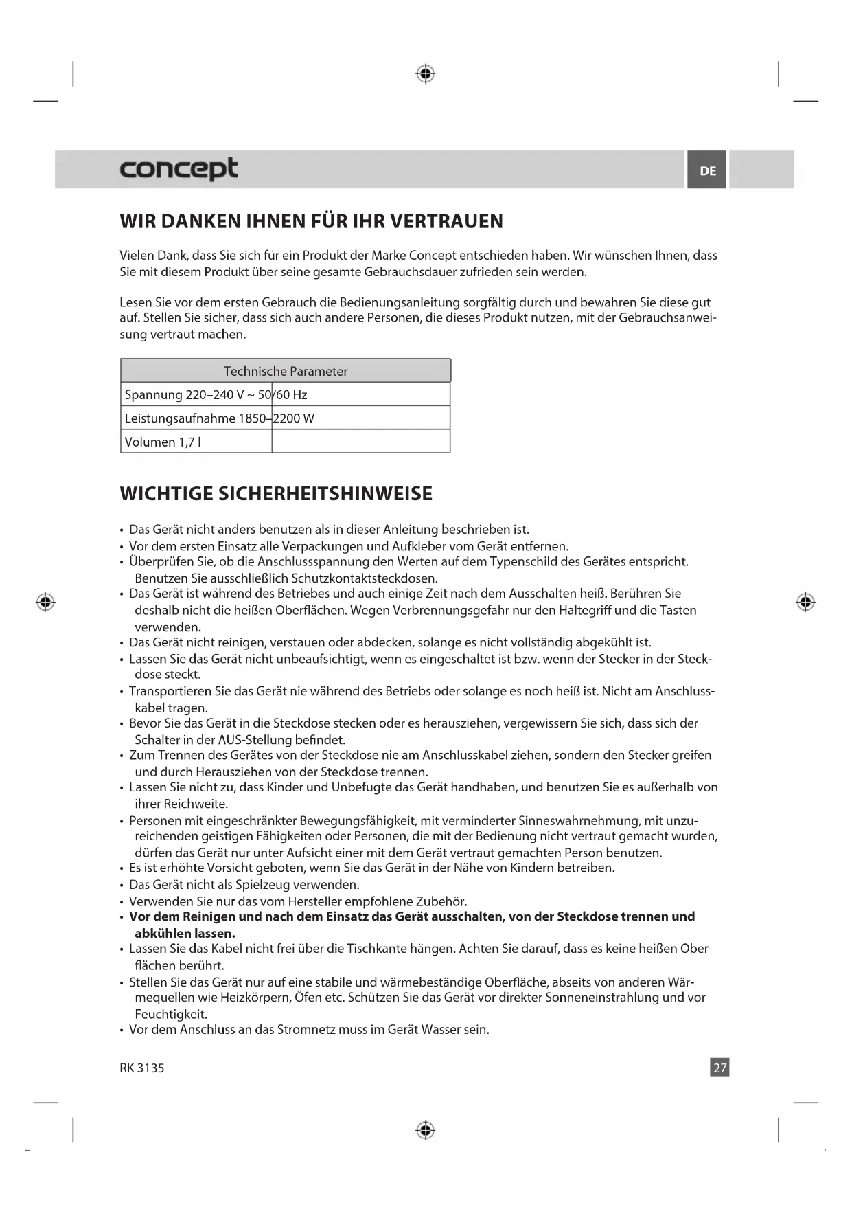 WIR DANKEN IHNEN FÜR IHR VERTRAUEN Vielen Dank, dass Sie sich für ein Produkt der Marke Concept entschieden haben. Wir wünschen Ihnen, dass Sie mit diesem Produkt über seine gesamte Gebrauchsdauer zufrieden sein werden. Lesen Sie vor dem ersten Gebrauch die Bedienungsanleitung sorgfältig durch und bewahren Sie diese gut auf. Stellen Sie sicher, dass sich auch andere Personen, die dieses Produkt nutzen, mit der Gebrauchsanwei- sung vertraut machen. Technische Parameter Spannung 220–240 V ~ 50/60 Hz Leistungsaufnahme 1850–2200 W Volumen 1,7 l WICHTIGE SICHERHEITSHINWEISE