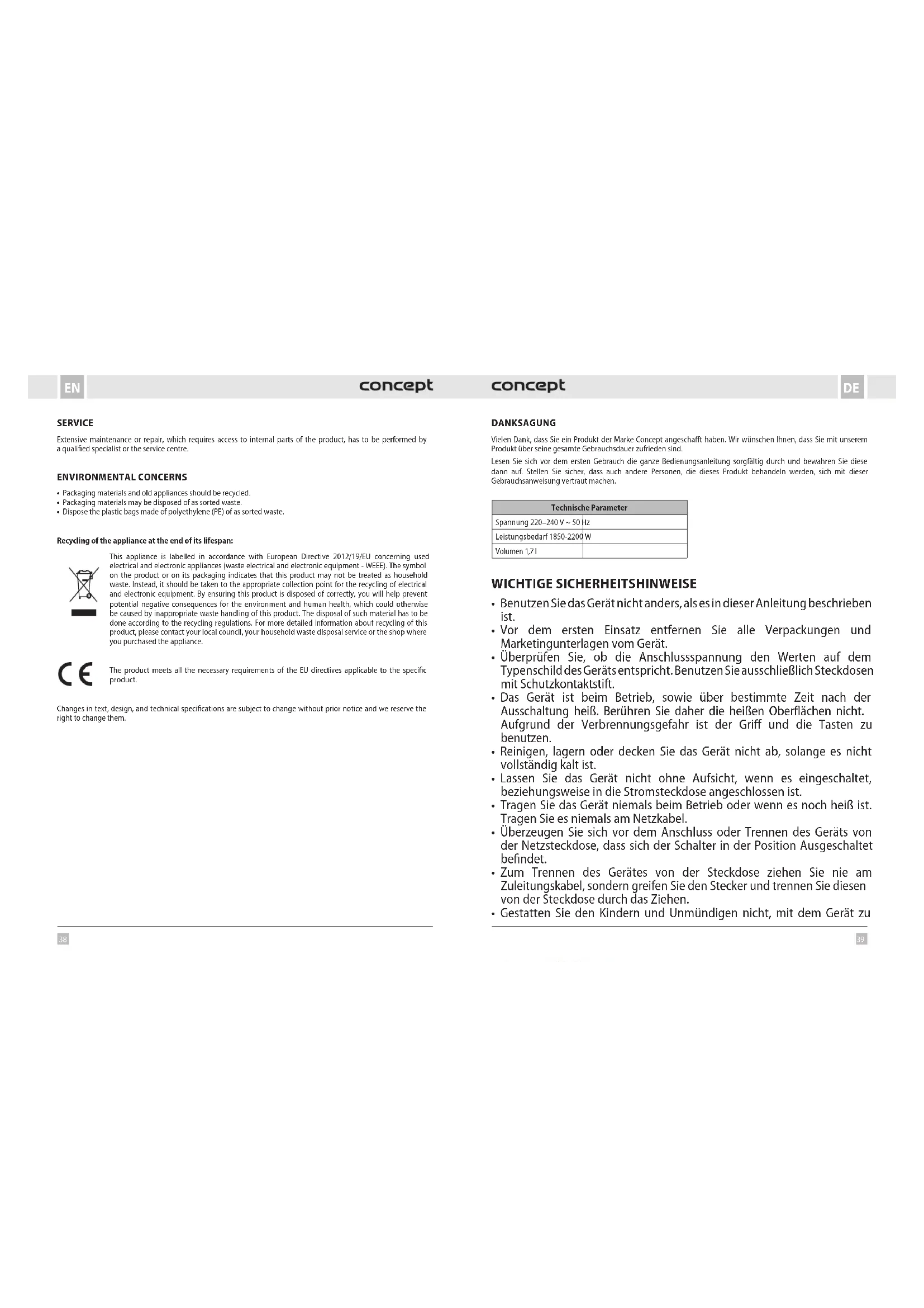 - Die Polyäthylen-Beutel (PE) geben Sie zum Recyceln des Sammelmaterials ab. Recycling des Gerätes am Ende seiner Lebensdauer: Dieses Gerät ist im Einklang mit der Europäischen Richtlinie 2012/19/EU über Elektro- und Elektronik-Altgeräte (WEEE) gekennzeichnet. Das Symbol am Produkt oder an dessen Verpackung gibt an, dass dieses Produkt nicht in den Haushaltsabfall gehört. Es ist auf eine Sammelstelle zum Recyceln der elektrischen und elektronischen Anlagen zu bringen. Durch die Sicherstellung der korrekten Entsorgung dieses Produktes helfen Sie, negative Konsequenzen für die Umwelt und die Gesundheit der Menschen zu verhindern, die durch die unsachgemäße Entsorgung dieses Produktes verursacht würden. Die Entsorgung muss im Einklang mit den Vorschriften für die Abfallbehandlung durchgeführt werden. Ausführlichere Informationen zum Recycling dieses Produkts erhalten Sie bei der zuständigen örtlichen Behörde, dem Dienstleister für Entsorgung von Haushaltsabfall oder in dem Geschäft, wo Sie das Produkt gekauft haben. Dieses Produkt erfüllt sämtliche Grundanforderungen der EU-Richtlinien, die sich darauf beziehen. Lebensmittel sind Die Änderungen im Text, im Design und in den technischen Spezifizierungen können ohne vorherigen Hinweis geändert werden, und wir behalten uns das Recht auf deren Änderungen vor. MERCI Nous vous remercions d’avoir acheté le produit de la marque Concept et nous espérons qu’il vous apportera votre entière satisfaction pendant son utilisation. Lire attentivement le manuel d’emploi avant la première utilisation et le conserver. Faire prendre connaissance du manuel d’emploi par les autres personnes pouvant manipuler le produit. Caractéristiques techniques Tension 220–240 V ~ 50 Hz Puissance 1850-2200 W Volume 1,7l PRÉCAUTIONS PARTICULIÈRES DE SÉCURITÉ