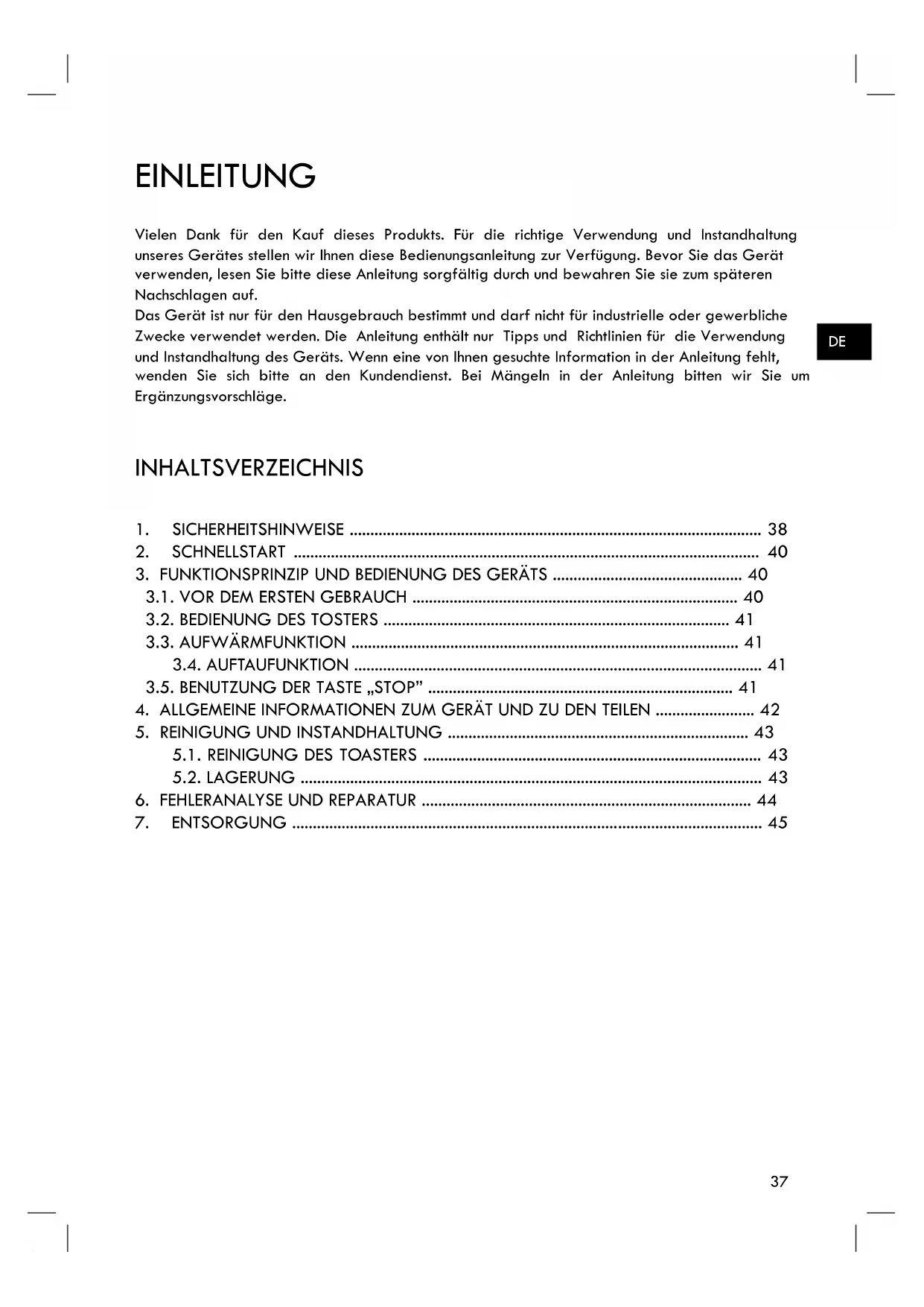 - EINLEITUNG Vielen Dank für den Kauf dieses Produkts. Für die richtige Verwendung und Instandhaltung unseres Gerätes stellen wir Ihnen diese Bedienungsanleitung zur Verfügung. Bevor Sie das Gerät verwenden, lesen Sie bitte diese Anleitung sorgfältig durch und bewahren Sie sie zum späteren Nachschlagen auf. Das Gerät ist nur für den Hausgebrauch bestimmt und darf nicht für industrielle oder gewerbliche Zwecke verwendet werden. Die Anleitung enthält nur Tipps und Richtlinien für die Verwendung und Instandhaltung des Geräts. Wenn eine von Ihnen gesuchte Information in der Anleitung fehlt, wenden Sie sich bitte an den Kundendienst. Bei Mängeln in der Anleitung bitten wir Sie um Ergänzungsvorschläge. INHALTSVERZEICHNIS 1. SICHERHEITSHINWEISE p. 38