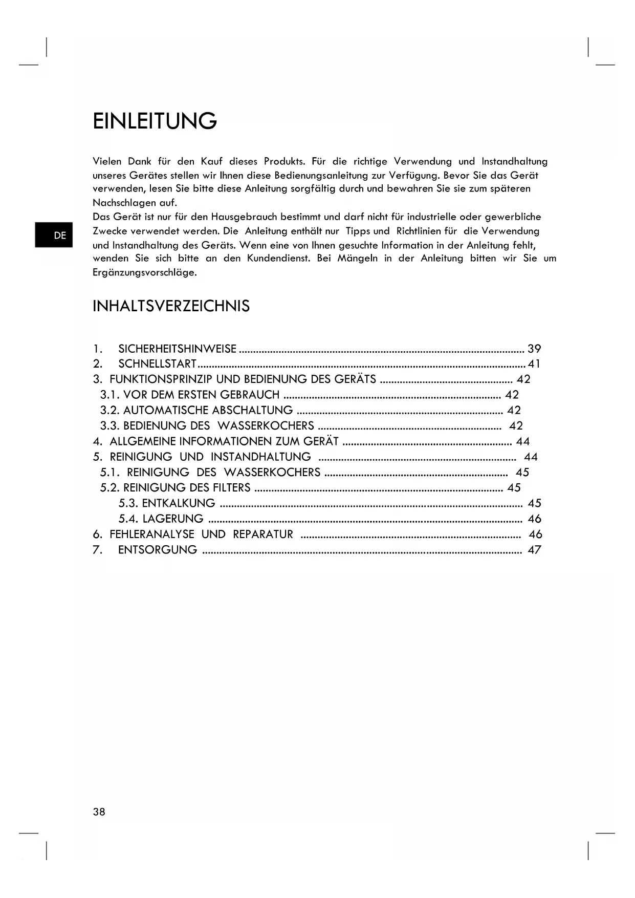 EINLEITUNG Vielen Dank für den Kauf dieses Produkts. Für die richtige Verwendung und Instandhaltung unseres Gerätes stellen wir Ihnen diese Bedienungsanleitung zur Verfügung. Bevor Sie das Gerät verwenden, lesen Sie bitte diese Anleitung sorgfältig durch und bewahren Sie sie zum späteren Nachschlagen auf. Das Gerät ist nur für den Hausgebrauch bestimmt und darf nicht für industrielle oder gewerbliche Zwecke verwendet werden. Die Anleitung enthält nur Tipps und Richtlinien für die Verwendung und Instandhaltung des Geräts. Wenn eine von Ihnen gesuchte Information in der Anleitung fehlt, wenden Sie sich bitte an den Kundendienst. Bei Mängeln in der Anleitung bitten wir Sie um Ergänzungsvorschläge. 1. SICHERHEITSHINWEISE ..................................................................................................... 39 2. SCHNELLSTART .................................................................................................................... 41