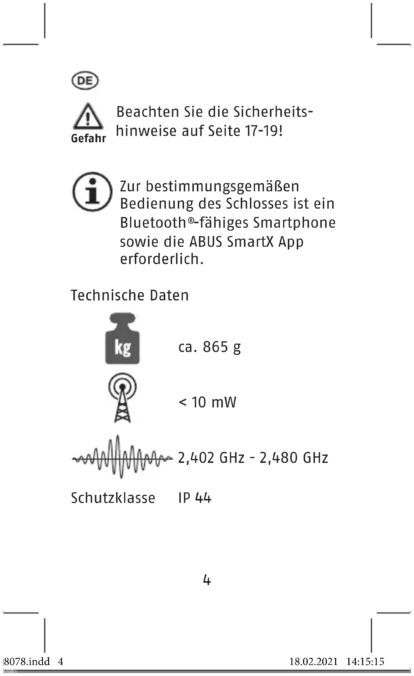 -fähiges Smartphone sowie die ABUS SmartX App erforderlich. Technische Daten Schutzklasse IP 44 ca. 865 g < 10 mW 2,402 GHz - 2,480 GHz Gefahr 8078.indd 48078.indd 4 18.02.2021 14:15:1518.02.2021 14:15:155 Damit Sie das Schloss nutzen können, muss zunächst der Akku vollständig geladen werden. Bitte beachten Sie die Sicher- heitshinweise!