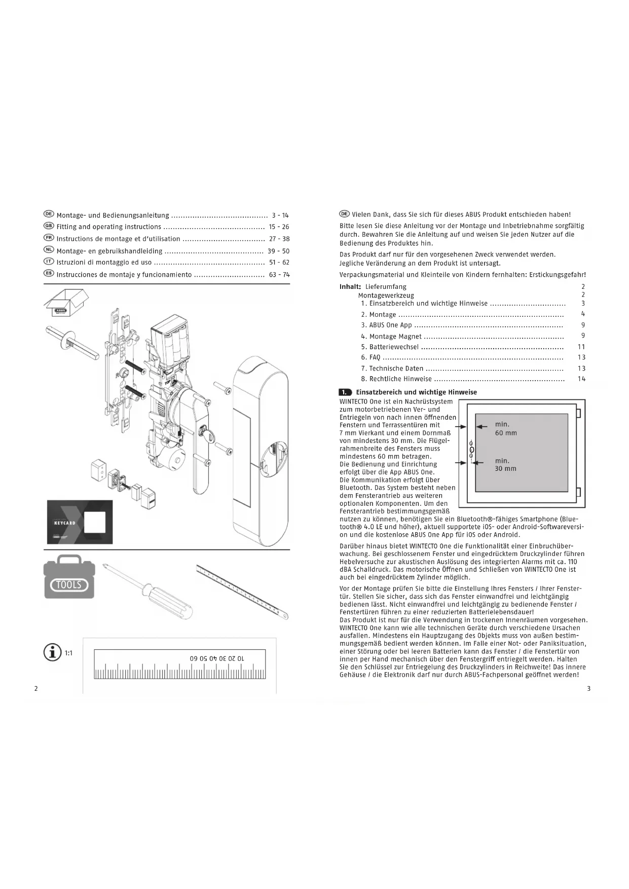 1:1 TOOLS Vielen Dank, dass Sie sich für dieses ABUS Produkt entschieden haben! Bitte lesen Sie diese Anleitung vor der Montage und Inbetriebnahme sorgfältig durch. Bewahren Sie die Anleitung auf und weisen Sie jeden Nutzer auf die Bedienung des Produktes hin. Das Produkt darf nur für den vorgesehenen Zweck verwendet werden. Jegliche Veränderung an dem Produkt ist untersagt. Verpackungsmaterial und Kleinteile von Kindern fernhalten: Erstickungsgefahr! Inhalt: Lieferumfang Montagewerkzeug