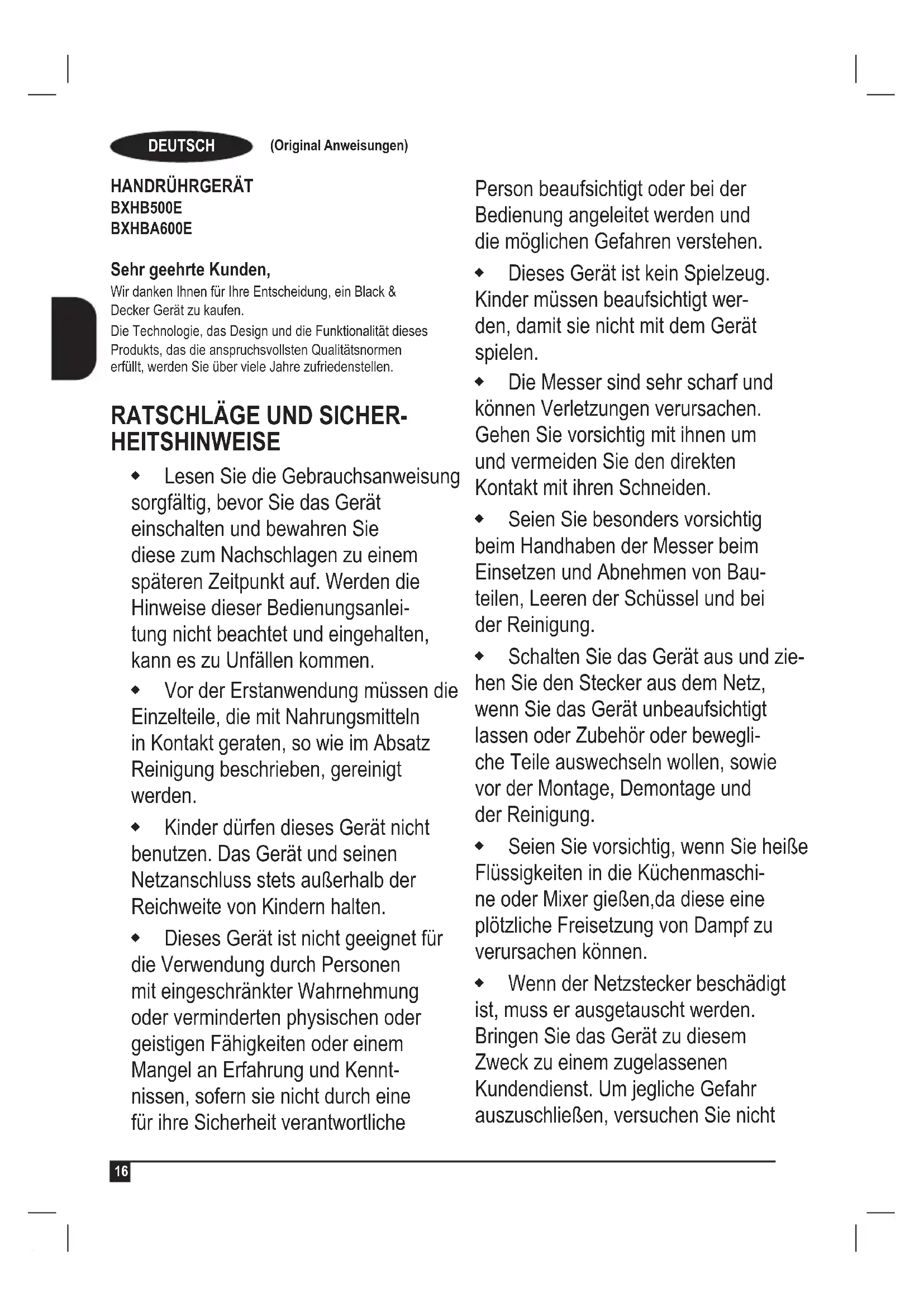 BXHB500E BXHBA600E Sehr geehrte Kunden, Wir danken Ihnen für Ihre Entscheidung, ein Black & Decker Gerät zu kaufen. Die Technologie, das Design und die Funktionalität dieses Produkts, das die anspruchsvollsten Qualitätsnormen erfüllt, werden Sie über viele Jahre zufriedenstellen.
