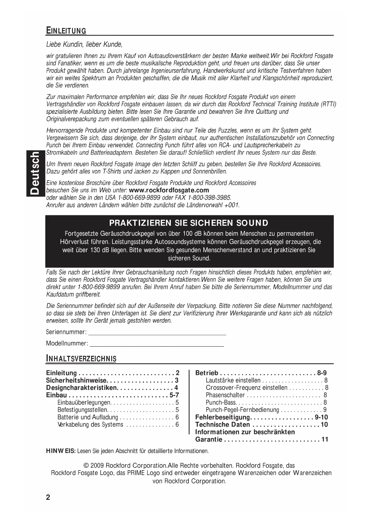 - Fortgesetzte Geräuschdruckpegel von über 100 dB können beim Menschen zu permanentem Hörverlust führen. Leistungsstarke Autosoundsysteme können Geräuschdruckpegel erzeugen, die weit über 130 dB liegen. Bitte wenden Sie gesunden Menschenverstand an und praktizieren Sie sicheren Sound. HINWEIS: Lesen Sie jeden Abschnitt für detaillierte Informationen. Falls Sie nach der Lektüre Ihrer Gebrauchsanleitung noch Fragen hinsichtlich dieses Produkts haben, empfehlen wir, dass Sie einen Rockford Fosgate Vertragshändler kontaktieren.Wenn Sie weitere Fragen haben, können Sie uns direkt unter 1-800-669-9899 anrufen. Bei Ihrem Anruf haben Sie bitte die Seriennummer, Modellnummer und das Kaufdatum griffbereit. Die Seriennummer befindet sich auf der Außenseite der Verpackung. Bitte notieren Sie diese Nummer nachfolgend, so dass sie stets bei Ihren Unterlagen ist. Sie dient zur Verifizierung Ihrer Werksgarantie und kann sich als nützlich erweisen, sollte Ihr Gerät jemals gestohlen werden. Seriennummer: ______________________________________ Modellnummer: _____________________________________ Einleitung p. 2