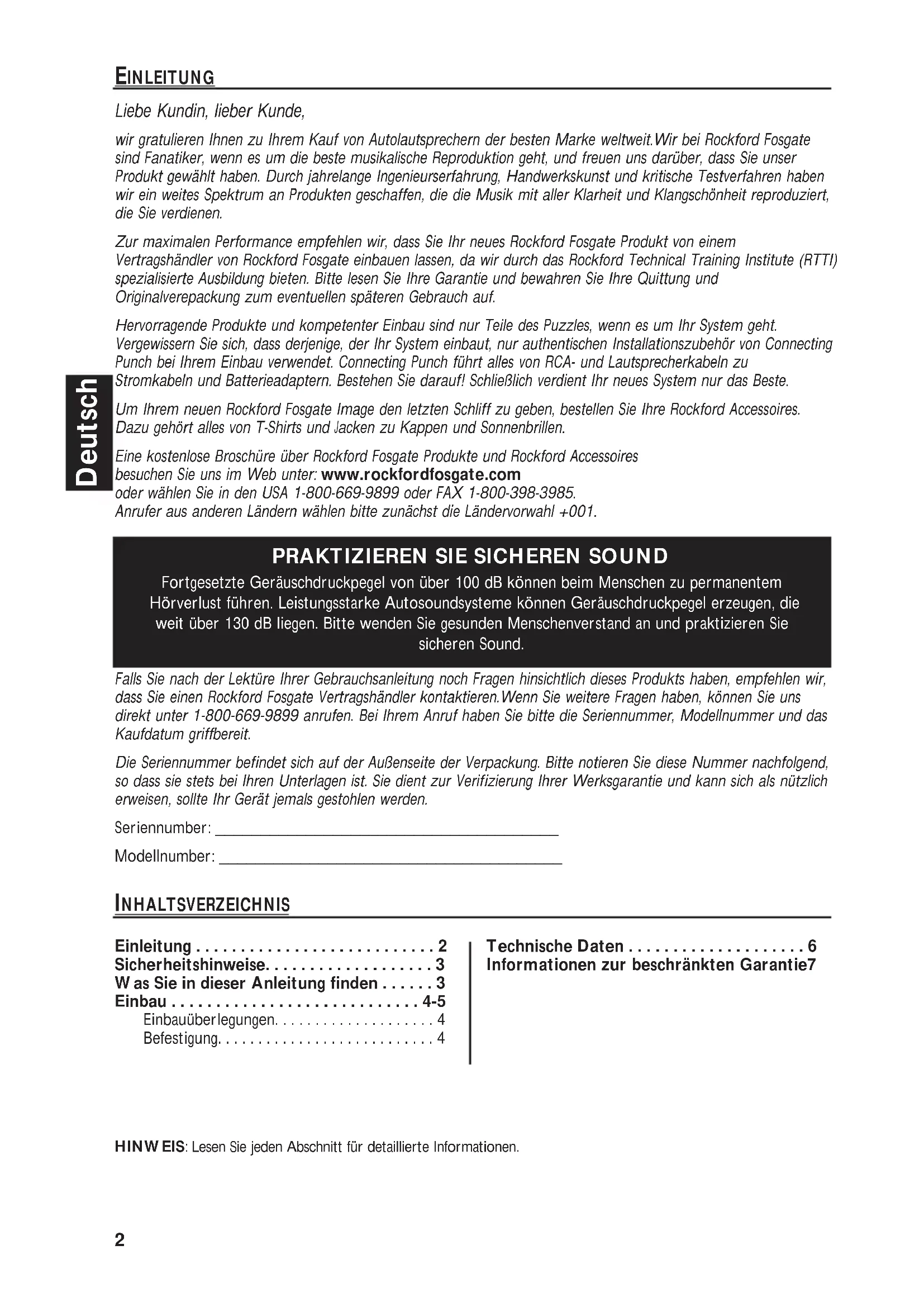 - Fortgesetzte Geräuschdruckpegel von über 100 dB können beim Menschen zu permanentem Hörverlust führen. Leistungsstarke Autosoundsysteme können Geräuschdruckpegel erzeugen, die weit über 130 dB liegen. Bitte wenden Sie gesunden Menschenverstand an und praktizieren Sie sicheren Sound. HINWEIS: Lesen Sie jeden Abschnitt für detaillierte Informationen. Falls Sie nach der Lektüre Ihrer Gebrauchsanleitung noch Fragen hinsichtlich dieses Produkts haben, empfehlen wir, dass Sie einen Rockford Fosgate Vertragshändler kontaktieren.Wenn Sie weitere Fragen haben, können Sie uns direkt unter 1-800-669-9899 anrufen. Bei Ihrem Anruf haben Sie bitte die Seriennummer, Modellnummer und das Kaufdatum griffbereit. Die Seriennummer befindet sich auf der Außenseite der Verpackung. Bitte notieren Sie diese Nummer nachfolgend, so dass sie stets bei Ihren Unterlagen ist. Sie dient zur Verifizierung Ihrer Werksgarantie und kann sich als nützlich erweisen, sollte Ihr Gerät jemals gestohlen werden. Seriennumber: ______________________________________ Modellnumber: ______________________________________ Einleitung p. 2