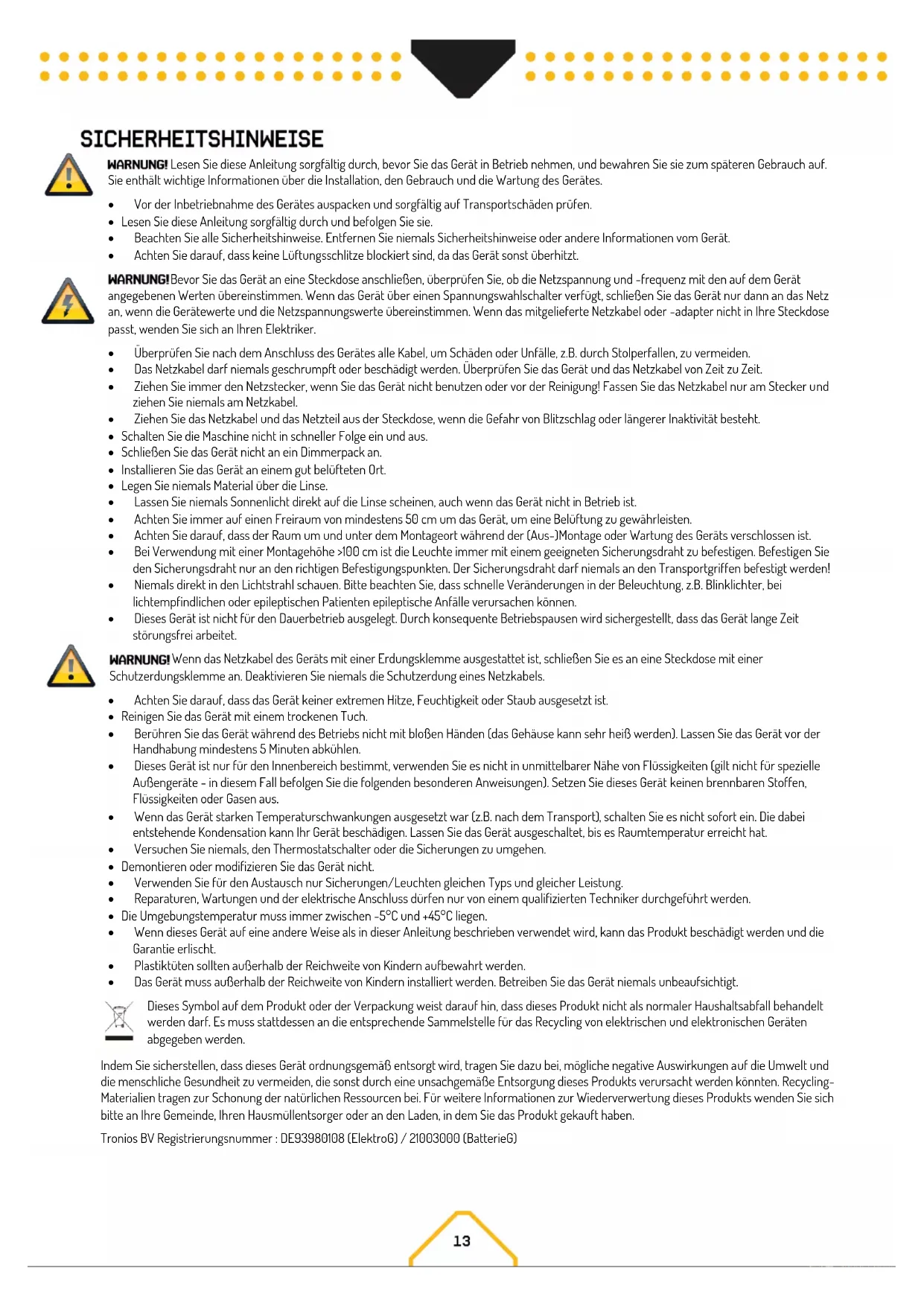 - Das Gerät muss außerhalb der Reichweite von Kindern installiert werden. Betreiben Sie das Gerät niemals unbeaufsichtigt. Dieses Symbol auf dem Produkt oder der Verpackung weist darauf hin, dass dieses Produkt nicht als normaler Haushaltsabfall behandelt werden darf. Es muss stattdessen an die entsprechende Sammelstelle für das Recycling von elektrischen und elektronischen Geräten abgegeben werden. Indem Sie sicherstellen, dass dieses Gerät ordnungsgemäß entsorgt wird, tragen Sie dazu bei, mögliche negative Auswirkungen auf die Umwelt und die menschliche Gesundheit zu vermeiden, die sonst durch eine unsachgemäße Entsorgung dieses Produkts verursacht werden könnten. Recycling- Materialien tragen zur Schonung der natürlichen Ressourcen bei. Für weitere Informationen zur Wiederverwertung dieses Produkts wenden Sie sich bitte an Ihre Gemeinde, Ihren Hausmüllentsorger oder an den Laden, in dem Sie das Produkt gekauft haben. Tronios BV Registrierungsnummer : DE93980108 (ElektroG) / 21003000 (BatterieG)Packen Sie den Karton sofort nach Erhalt sorgfältig aus, überprüfen Sie seinen Inhalt, um sicherzustellen, dass alle Teile vorhanden sind und in gutem Zustand erhalten wurden. Bei Transportschäden oder fehlenden Teilen ist der Verkäufer unverzüglich zu informieren. Lagern Sie die Verpackung und das Verpackungsmaterial. Wenn das Produkt zurückgegeben werden muss, ist es wichtig, dass das Produkt in der Originalverpackung zurückgegeben wird. Wenn das Gerät drastischen Temperaturunterschieden ausgesetzt war (z.B. nach dem Transport), schalten Sie es nicht sofort ein. Die dabei entstehende Kondensation kann das Gerät beschädigen. Vergewissern Sie sich, dass das Gerät Raumtemperatur hat, und stecken Sie dann den Netzstecker in die Steckdose. Auf der Rückseite von das Gerät wird angezeigt, an welche Netzspannung es angeschlossen werden muss. Prüfen Sie, ob die Netzspannung mit dieser übereinstimmt. Wenn die Netzspannung von der angegebenen abweicht, kann das Gerät irreparabel beschädigt werden. Das Gerät muss auch direkt an die Netzspannung angeschlossen werden. Es darf kein Dimmer oder eine einstellbare Stromversorgung verwendet werden. Das Gerät verfügt über einen powerconnector Netzausgang. Entsprechend der örtlichen Gegebenheiten können mehrere Geräte durch powerconnector Ein- und Ausgang verlinkt werden. Verbinden Sie maximal vier (bei Benutzung von 230V/16A) P12 in einer Reihe. Nutzen Sie dafür ein zugelassenes dreiadriges Kabel mit min. 1,5 mm² Querschnitt. Dabei sind die Installationshinweise vom Hersteller und die Farbkodierung des Kabels zu beachten. Schalten Sie das Gerät nicht durch Drehen des powerconnector aus, sondern verwenden Sie den Ein-/Ausschalter oder ziehen Sie den Netzstecker! Schließen Sie das Gerät immer an einen geschützten Stromkreis an (Fehlerstromschutzschalter oder Sicherung). Vergewissern Sie sich, dass das Gerät ausreichend elektrisch geerdet ist, um die Gefahr eines Stromschlags oder Brandes zu vermeiden. Das Gerät kann auf einer stabilen und ebenen Fläche aufgestellt werden. Durch die Befestigungsmöglichkeiten der Grundplatte kann das Gerät auch kopfüber an einer Traverse montiert werden, siehe untenstehende Abbildung. Für die Befestigung sind zertifizierte Klemmen mit korrekter Tragfähigkeit erforderlich. Der Montageort muss ausreichend stabil sein und ein Gewicht von dem 10-fachen des Gerätegewichts tragen können. Befestigen Sie das Gerät mit einem Sicherheitskabel so, dass es nicht herunterfallen kann. Befolgen Sie bei der Durchführung einer Installation immer die europäischen und nationalen Richtlinien bezüglich Rigging, Traversen und allen anderen Sicherheitsaspekten. Lassen Sie die Installation immer von einem autorisierten Fachhändler prüfen! Wenn Sie einen Standard-DMX-Controller verwenden, können Sie den DMX-Ausgang des Controller direkt mit dem DMX-Eingang des ersten Geräts verbinden. Verbinden Sie den DMX-Ausgang immer mit dem nächsten DMX-Eingang des nächsten Geräts, bis alle Geräte angeschlossen sind.