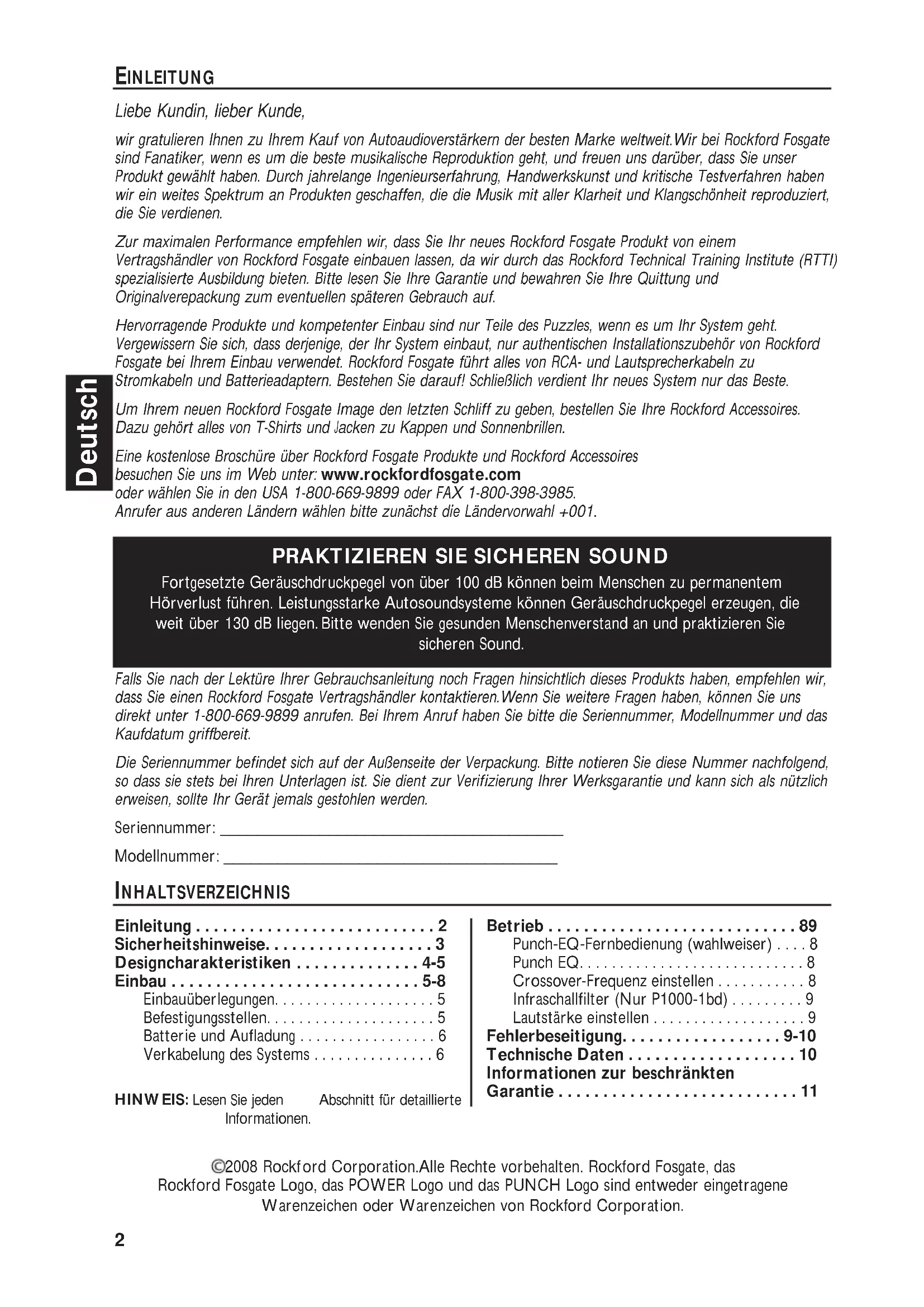 - Fortgesetzte Geräuschdruckpegel von über 100 dB können beim Menschen zu permanentem Hörverlust führen. Leistungsstarke Autosoundsysteme können Geräuschdruckpegel erzeugen, die weit über 130 dB liegen. Bitte wenden Sie gesunden Menschenverstand an und praktizieren Sie sicheren Sound. HINWEIS: Lesen Sie jeden Abschnitt für detaillierte Inf ormationen. Falls Sie nach der Lektüre Ihrer Gebrauchsanleitung noch Fragen hinsichtlich dieses Produkts haben, empfehlen wir, dass Sie einen Rockford Fosgate Vertragshändler kontaktieren.Wenn Sie weitere Fragen haben, können Sie uns direkt unter 1-800-669-9899 anrufen. Bei Ihrem Anruf haben Sie bitte die Seriennummer, Modellnummer und das Kaufdatum griffbereit. Die Seriennummer befindet sich auf der Außenseite der Verpackung. Bitte notieren Sie diese Nummer nachfolgend, so dass sie stets bei Ihren Unterlagen ist. Sie dient zur Verifizierung Ihrer Werksgarantie und kann sich als nützlich erweisen, sollte Ihr Gerät jemals gestohlen werden. Seriennummer: ______________________________________ Modellnummer: _____________________________________ Einleitung p. 2