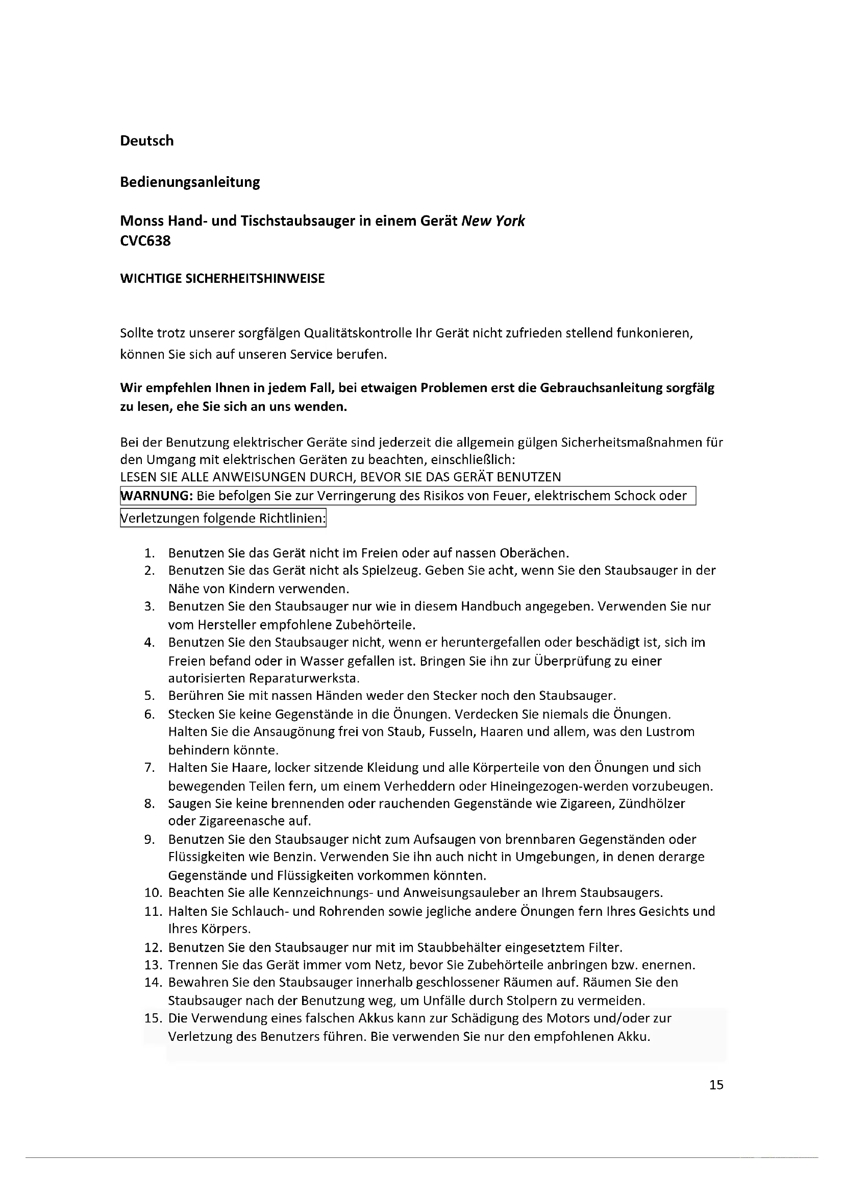 SERVICE Als u na het lezen van deze gebruiksaanwijzing nog vragen heeft over het product, kunt u contact opnemen met de Montiss klantenservice: Telefoonnummer: +31 (0) 45 5280 380 Trebs BV, Thermiekstraat 1A, 6361 HB Nuth, email: info@trebs.nl / info@montiss.com15 Deutsch Bedienungsanleitung Montiss Hand- und Tischstaubsauger in einem Gerät New York CVC638 WICHTIGE SICHERHEITSHINWEISE Sollte trotz unserer sorgfältigen Qualitätskontrolle Ihr Gerät nicht zufrieden stellend funktionieren, können Sie sich auf unseren Service berufen. Wir empfehlen Ihnen in jedem Fall, bei etwaigen Problemen erst die Gebrauchsanleitung sorgfältig zu lesen, ehe Sie sich an uns wenden. Bei der Benutzung elektrischer Geräte sind jederzeit die allgemein gültigen Sicherheitsmaßnahmen für den Umgang mit elektrischen Geräten zu beachten, einschließlich: LESEN SIE ALLE ANWEISUNGEN DURCH, BEVOR SIE DAS GERÄT BENUTZEN WARNUNG: Bitte befolgen Sie zur Verringerung des Risikos von Feuer, elektrischem Schock oder Verletzungen folgende Richtlinien: