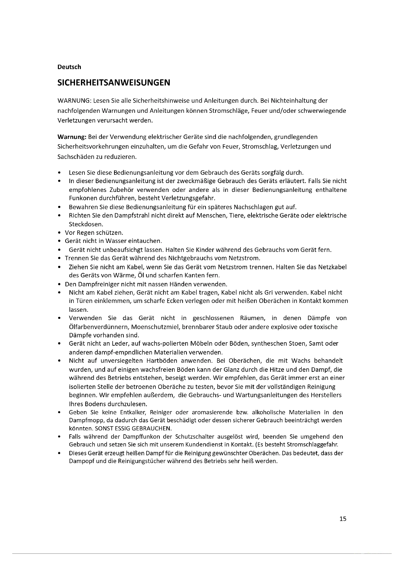 - Dieses Gerät erzeugt heißen Dampf für die Reinigung gewünschter Oberflächen. Das bedeutet, dass der Dampfkopf und die Reinigungstücher während des Betriebs sehr heiß werden.16 !Achtung: Tragen Sie immer geeignetes Schuhwerk, wenn Sie den Mopp verwenden oder Zubehör des Mopps auswechseln. Tragen Sie keine Pantoffeln oder anderes offenes Schuhwerk.
